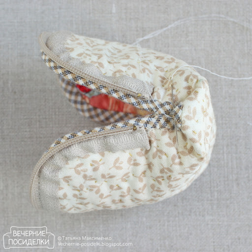 9. Сформируйте донышко. Для этого с изнаночной стороны сложите и стачайте уголок косметички или проложите вручную шов «назад иголку».