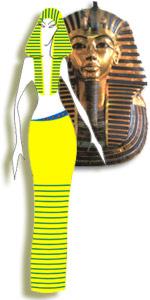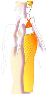 Например, обращаясь к теме Древнего Египта, можно использовать элементы египетского костюма: головная повязка (клафт), воротник-ожерелье (ускх), передник треугольной формы (схенти), конусообразные головные уборы, драпированное женское платье (калазирис). При этом стрельчатые складки плиссировки на переднике могут напоминать расходящиеся лучи солнца, а женская одежда из прозрачной ткани, окутывающая тело до самых щиколоток, создавать эффект тела раздетого и одетого одновременно.