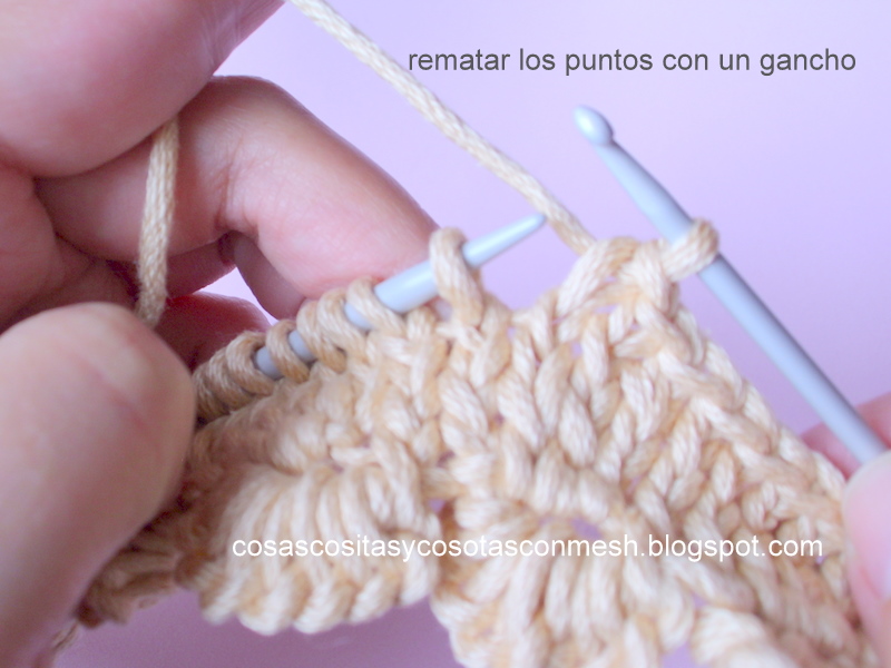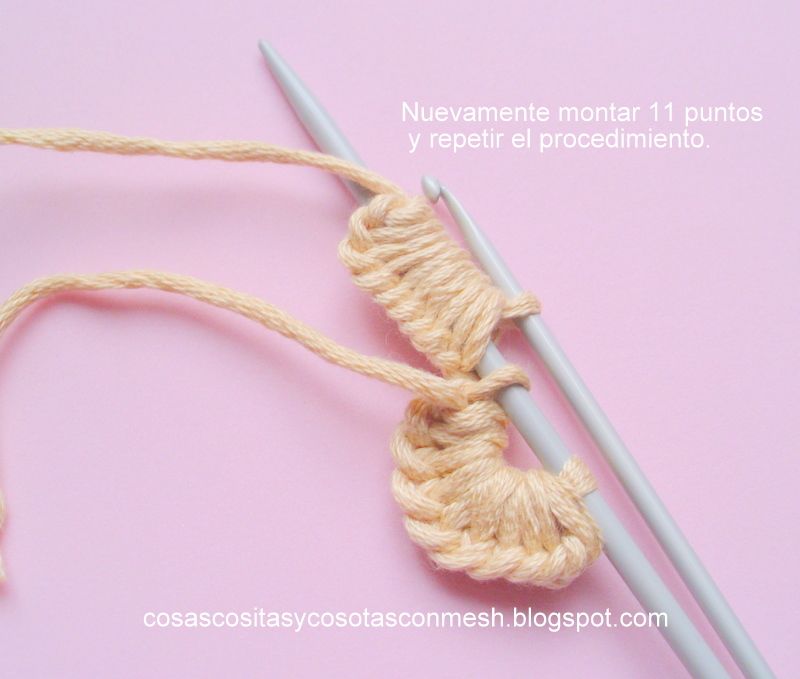 Ahora tejeremos la puntilla a 2 agujas y para eso haremos 3 aumentos a cada abanico .
