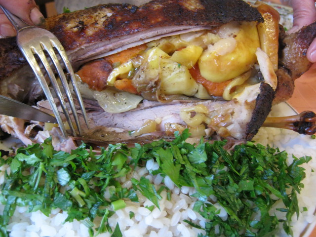 Утка извлекается из духовки, «отдыхает» 10-15 минут. Подавать утку с грушами и винным соусом, запеченную в духовке, лучше всего с отварным пропаренным рисом. Сказать, что это — вкусно, — ничего не сказать!