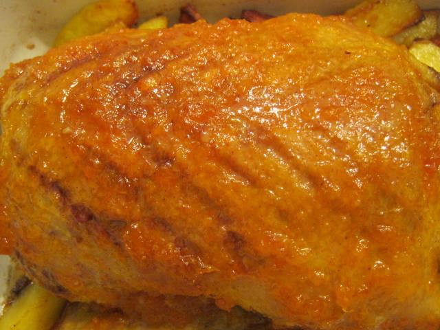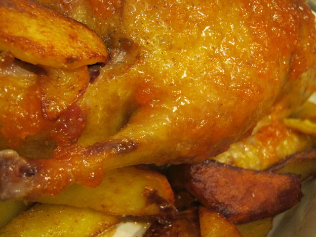 Готовим утку по любому указанному способу. За полчаса до готовности перекладываем утку в чистый противень, наливаем в него немного жира. Далее кладется утка, вокруг нее — дольки отваренного до полуготовности картофеля. печем все вместе в духовке до готовности утки. Подавать с цитрусовым или абрикосовым соусом ( по рецепту глазури выше).