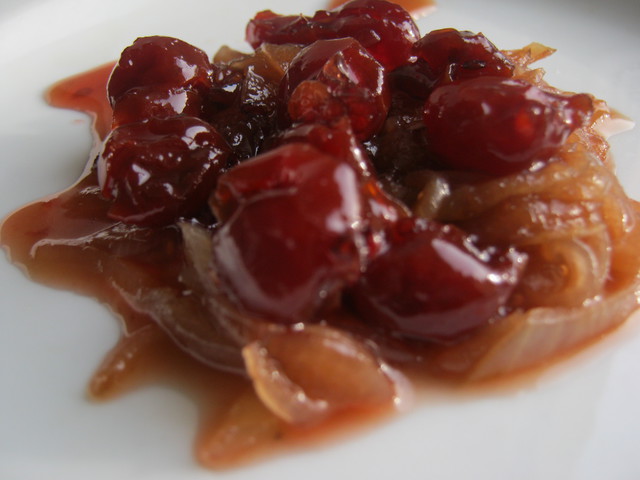 Соус готовим так. Из утиных потрохов ( шеи, крыльев) на маленьком огне варим насыщенный бульон. Для этого заливаем потроха 500 мл воды и на самом маленькои огне «томим» часа полтора. Лук чистим, режем тонкими полукольцами. Карамелизуем на утином жиру лук ( слегка до прозрачности поджариваем на маленьком огне, по чайной ложке доливаем 50 мл вина). Процесс займет минут 10-15. Добавить оставшиеся 100 мл вина, бульон, вишню. Готовить вместе секунд 30. Отрегулировать вкус добавкой соли и сахара.