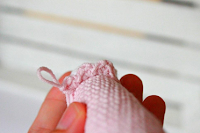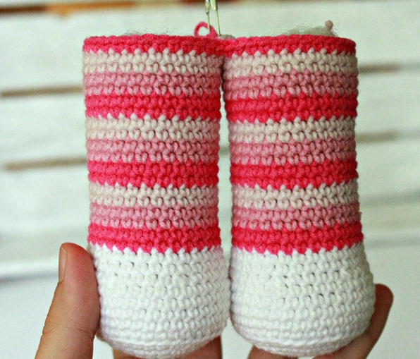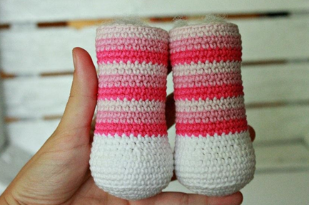 Нитью малинового цвета соединяем лапы между собой 3 СБН, ставим маркер и продолжаем вязать по кругу (это и будет начало нового круга).