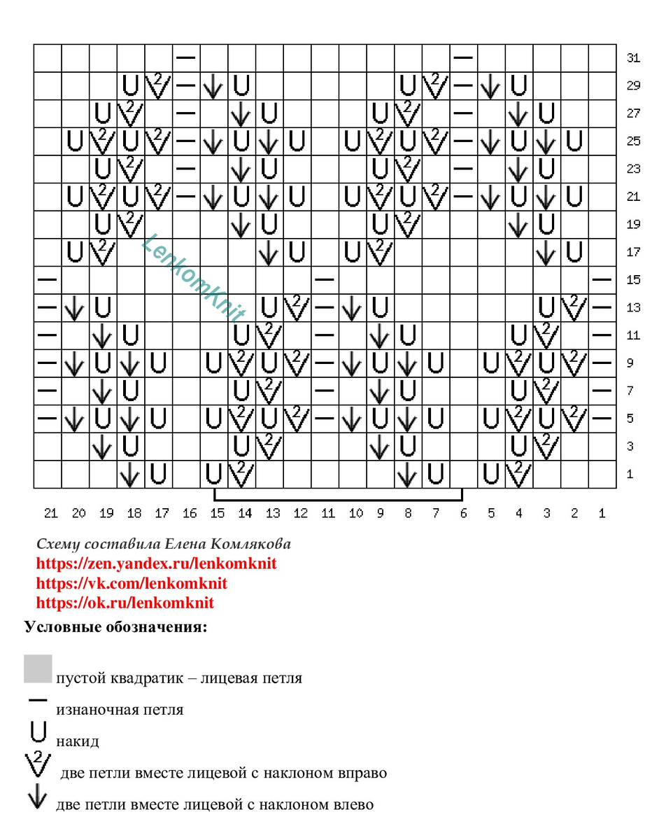 Схема узора приведена на рисунке. Раппорт ажурного узора - 32 ряда и 10 петель.