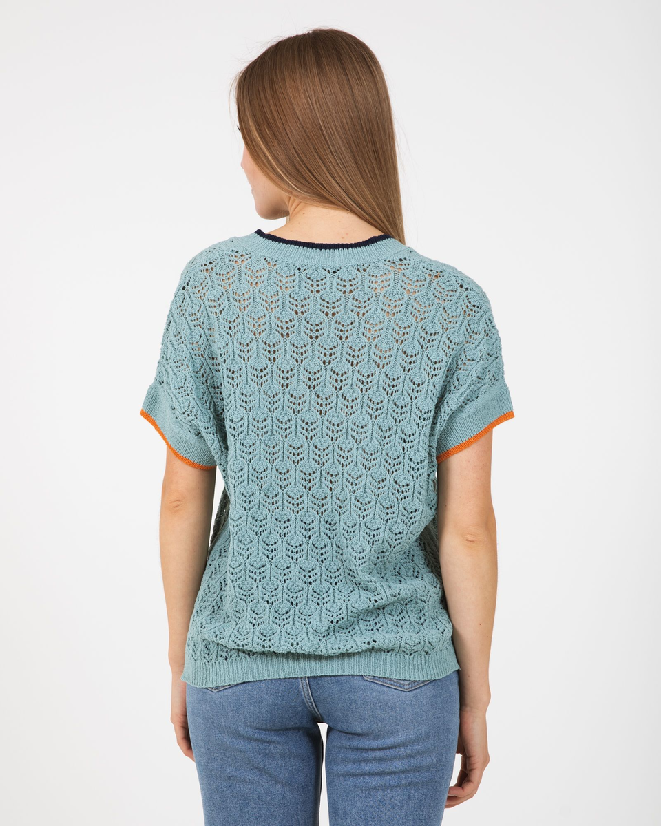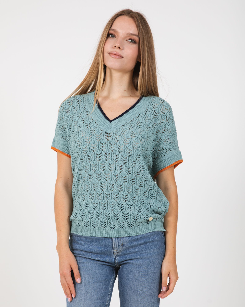 Этот топ интересен, в первую очередь, своим цветовым решением. Основной цвет - пастельный оттенок из двух цветов - голубого и зеленого. По краю треугольного ворота пропущена тонкая черная полоска, а по рукавам - оранжевая.
