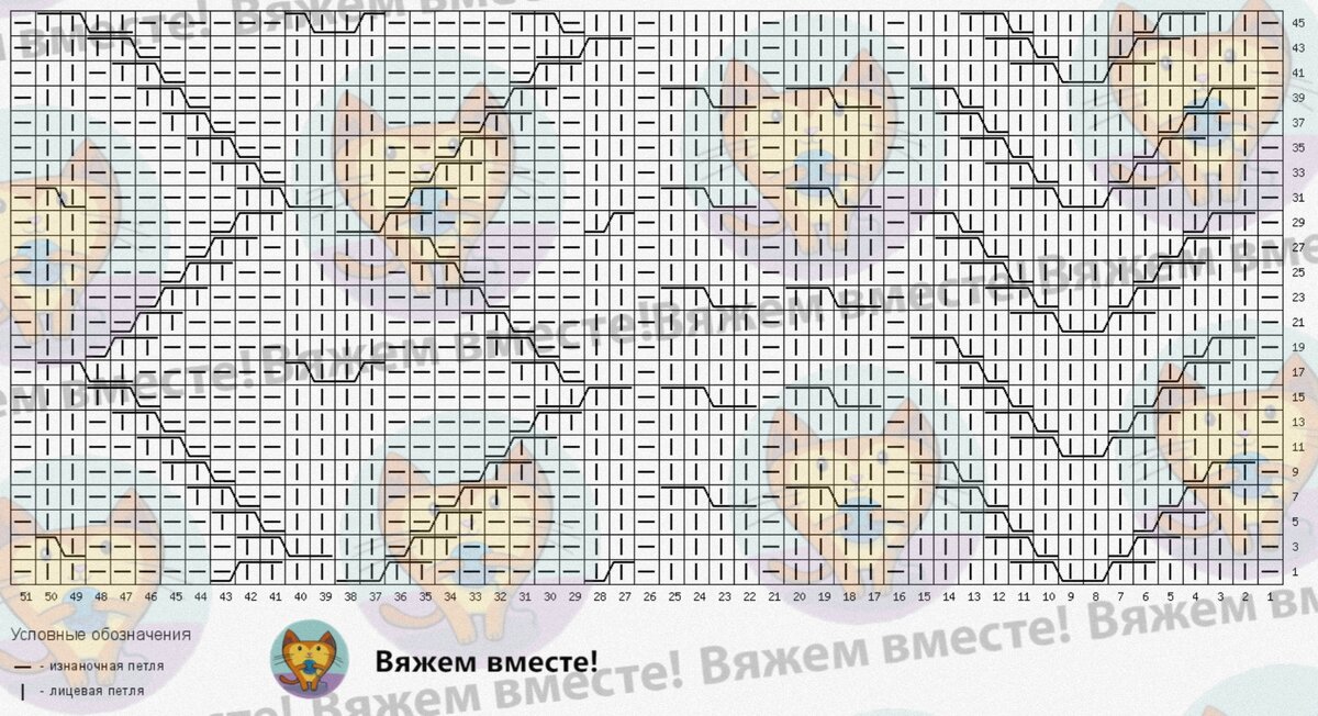 На схеме нарисована правая часть узора (левая вяжется симметрично) и только основные элементы, которые далее повторяются.