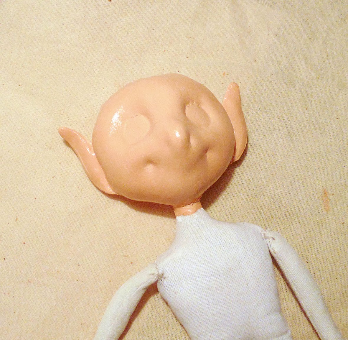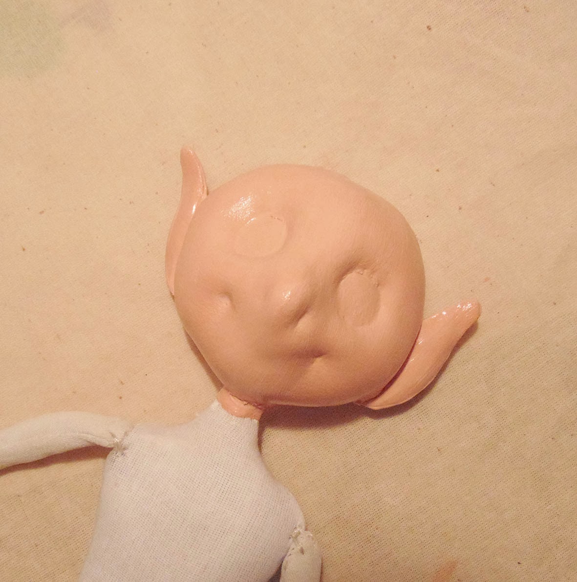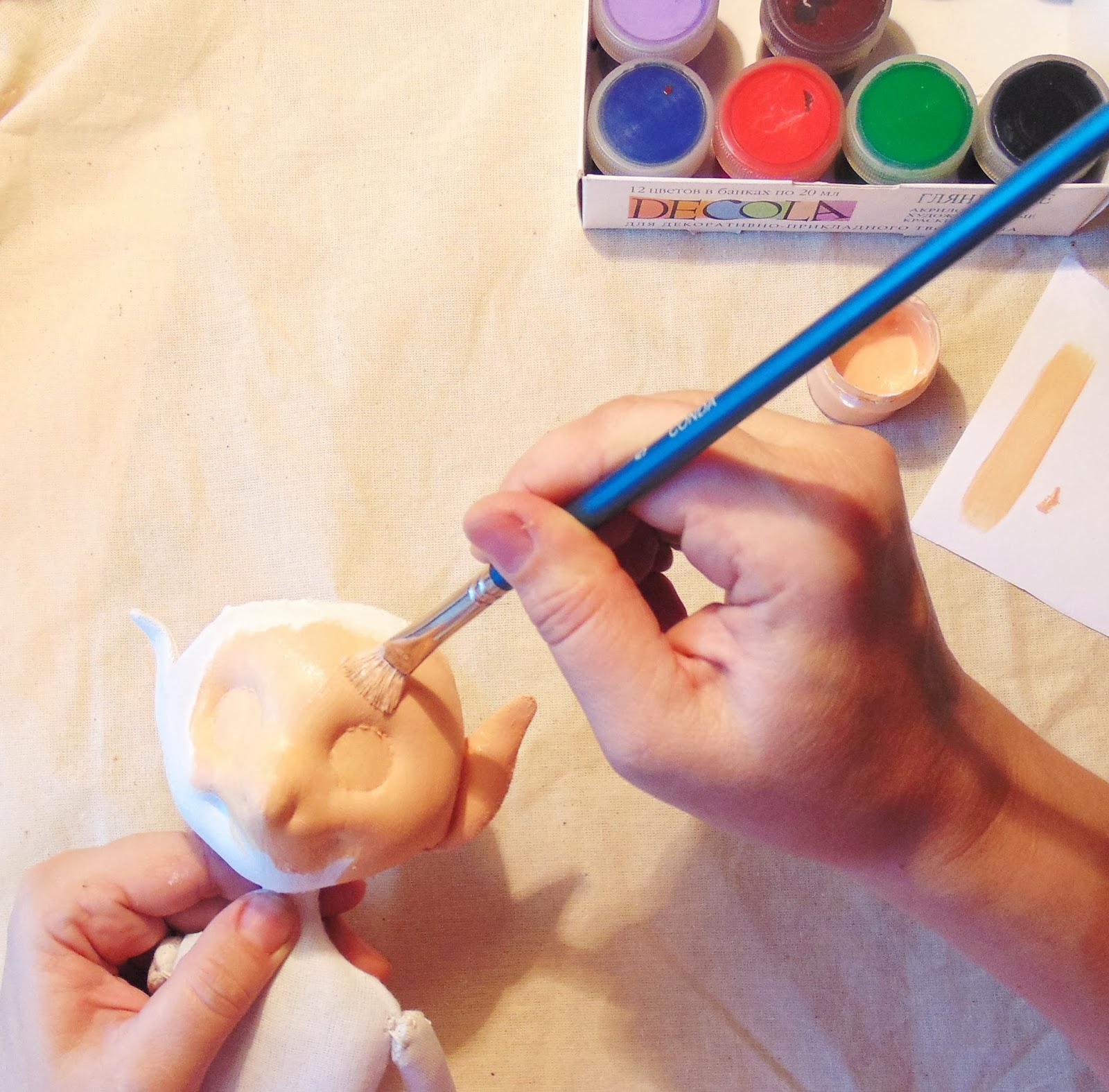 Потом была практическая работа по покрытию кукольной заготовки двумя слоями грунта. Первый слой - клей ПВА, второй слой белая акриловая краска (я использовала строительную). Покрывали мы только лицевую часть головы и сапожки Фея.