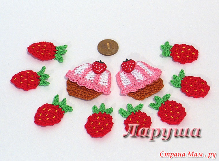 Клубничка Вязать прямыми и обратными рядами. Красной нитью набрать 3 в. п. и в 3-ю петлю от крючка связать 1ряд- 3 ст. б/нак. 2 ряд - 5 ст. б/нак., делая прибавки в начале и в конце ряда. 3 ряд - 5 ст. б/нак. 4 -7 ряд - 7 ст. б/нак. 8 ряд - 5 ст. б/нак. 9 ряд - 3 ст. б/нак. Присоединить зеленую нить и вязать хвостик- *ст. б/нак. в столбик предыдущего ряда (красный), 3 в. п., возвращаясь по ним вяжем 1 полустолбик б/нак., 2 ст. б/нак.* - повторяем от*до* 3 раза. Хвостик - это аналог лепестков подсолнуха. Желтой нитью вышиваем "семечки". Тортик Состоит из двух частей. Низ. Коричневой нитью вяжем цепочку из 10 в. п., затем 1 ряд - 8 ст. б/нак., 2-3 ряд - 10 ст. б/нак. 4-5 ряд - 12 ст. б/нак. Верх. Розовая нить - 1цвет, белая нить - 2 цвет. 1 цветом набираем 8 в. п. и вяжем 6 ст. б/нак., присоединяем 2 цвет (1 не обрываем!), 2 цветом - первый ряд 3 ст. б/нак., 3 полуст.1/нак., второй ряд - 6 ст. б/нак. опять 1 цветом два ряда по 6 ст. б/нак. и т. д. Получаются белые клинья (с расширением) и розовые полосочки (прямые). Провязав последний (четвёртый) раз 6 ст. б/нак. 1 цветом, поворачиваем вязание и обвязываем низ 12-ю ст. б/нак., затем в обратную сторону вяжем "веерочки" - в 1-ю петлю 3 полуст.1/нак., во 2-ю - 1 полуст. б/нак. И так 6 раз. Затем "поднимаемся" по боку полустолбиками б/нак., вяжем сверху кексика 1 ряд- 8 ст. б/нак. 2 ряд - 4 ст. б/нак., провязывая по два вместе. Нить обрываем. Нашиваем верхнюю часть на нижнюю, пришиваем пуговку-ягодку.