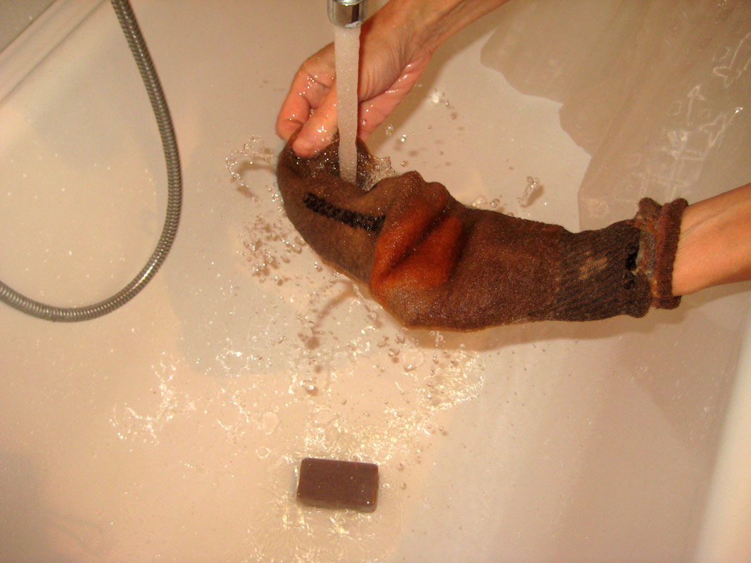 Носок вывернуть, подложить пол дырку губку, разровнять (на фото этого