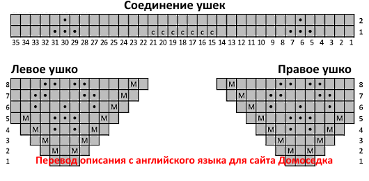 С лицевой стороны вязать по схеме Объединение ушек первые 14 петель Правого ушка, затем набрать 7 петель для задней стороны шапки, далее вязать по схеме петли Левого ушка. В следующем изнаночном ряду схемы вязать первые 17 петель, поместить маркер для обозначения центра задней стороны шапки, затем довязать ряд. Отрезать нить. Перенести 18 петель (включая центральный маркер) на правую спицу. Присоединить нить и вязать 17 лиц (левого ушка), набрать 19 петель, соединить ряд в круг и довязать до маркера = 54 петли в итоге.