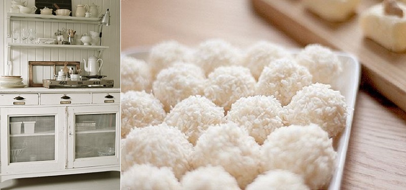 Если хорошенько смешать 400 г кокосовой стружки, 400 г сгущённого молока и 2 чайные ложки ванили, выложить чайной ложечкой на бумагу для выпечки и поставить в разогретую до 170 градусов духовку на 10 минут, то получатся прекрасные «рафаэлки» домашнего приготовления.