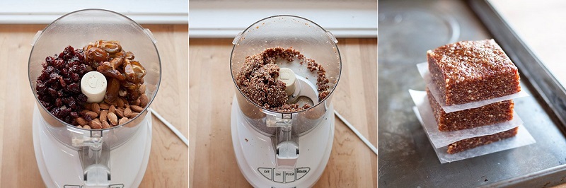 В блендере нужно смешать чашку орехов, которые можно предварительно обжарить в духовке, чашку любых сухофруктов и чашку фиников. Измельчать их нужно в течение 1-2 минут до состояния однородной массы. Получившуюся смесь выложить на противень, прижать сверху разделочной доской, чтобы получилась плоская поверхность, и поставить в холодильник минимум на час. После этого можно сделать из энергетической пластины много маленьких батончиков и наслаждаться.