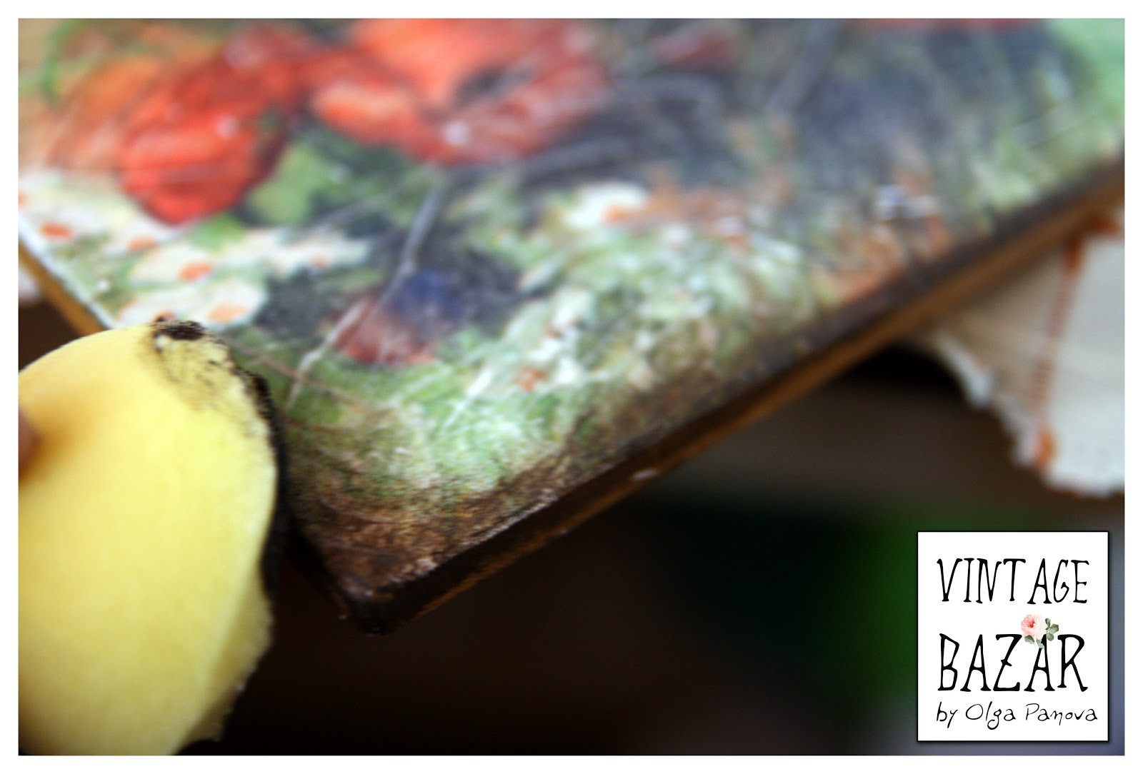 7. Тонируем края медиумом антик (если у вас нет такого, то просто замените темно-коричневой акриловой краской). Важно просушить спонж на бумаге, чтобы он был практически сухим.