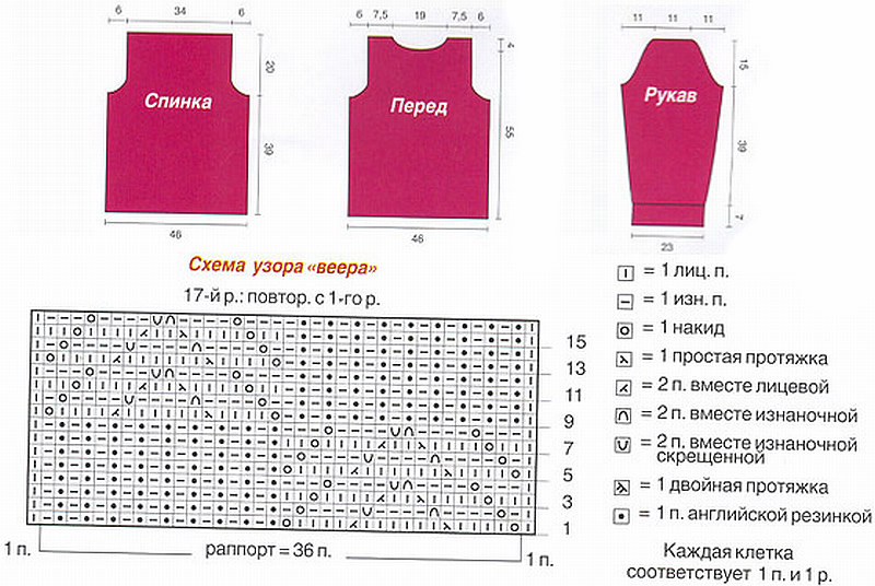 Рукав: спицами № 5 наберите 42 п. и для планки вяжите 2 р. полой резинкой и 14 р. резинкой 2/2 (всего = 7 см). Далее вяжите на спицах №5,5 узором "веера", убавляя 4 п. в 1-м р. С обеих сторон прибавляйте в каждом 6-м р. 8 раз по 1 п. и вяжите эти новые петли, чередуя 8 р. английской резинки (как для первых 8 р. узора "веера") и 8 р. лиц. глади. На высоте 39 см от планки (= 74 р.) закройте с обеих сторон для оката в каждом 2-м р. 1 раз 5 п., 13 раз 1 п. На высоте 15 см от начала оката (= 28 р.) закройте оставшиеся 18 п.