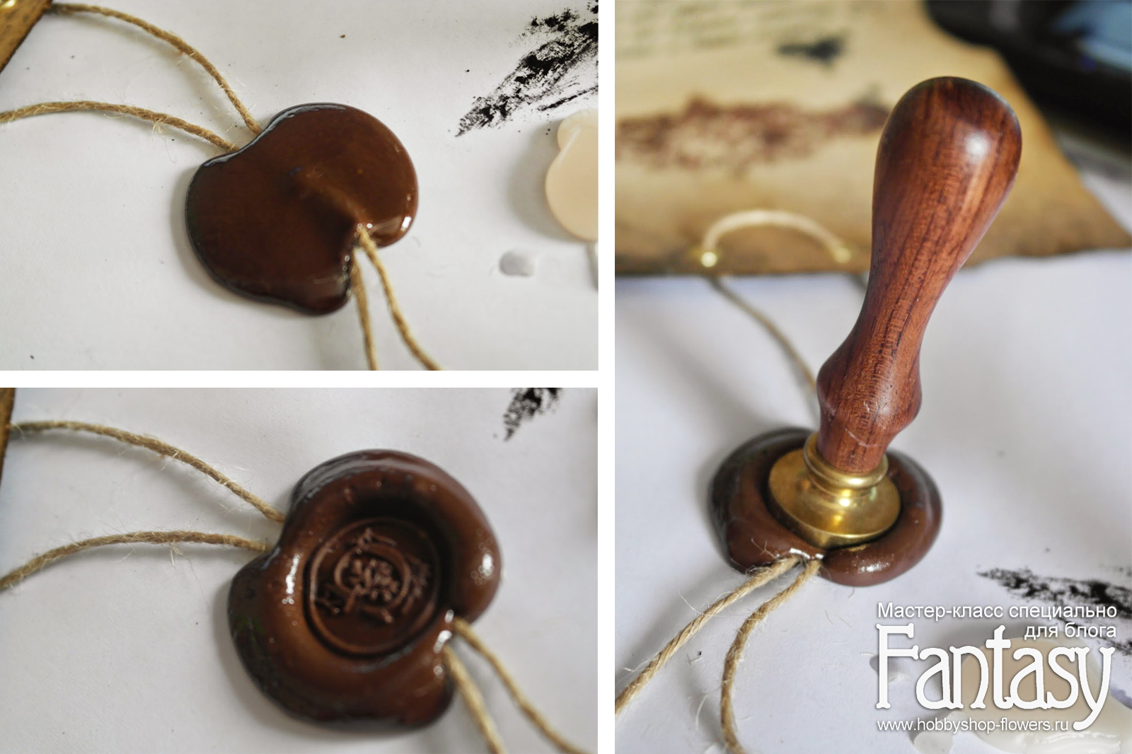 Даем сургучу равномерно растечься и ставим печать... Не расстраивайтесь - если у вас ее нет, можно использовать старую ложку с красивой ручкой или красивую металлическую пуговицу.