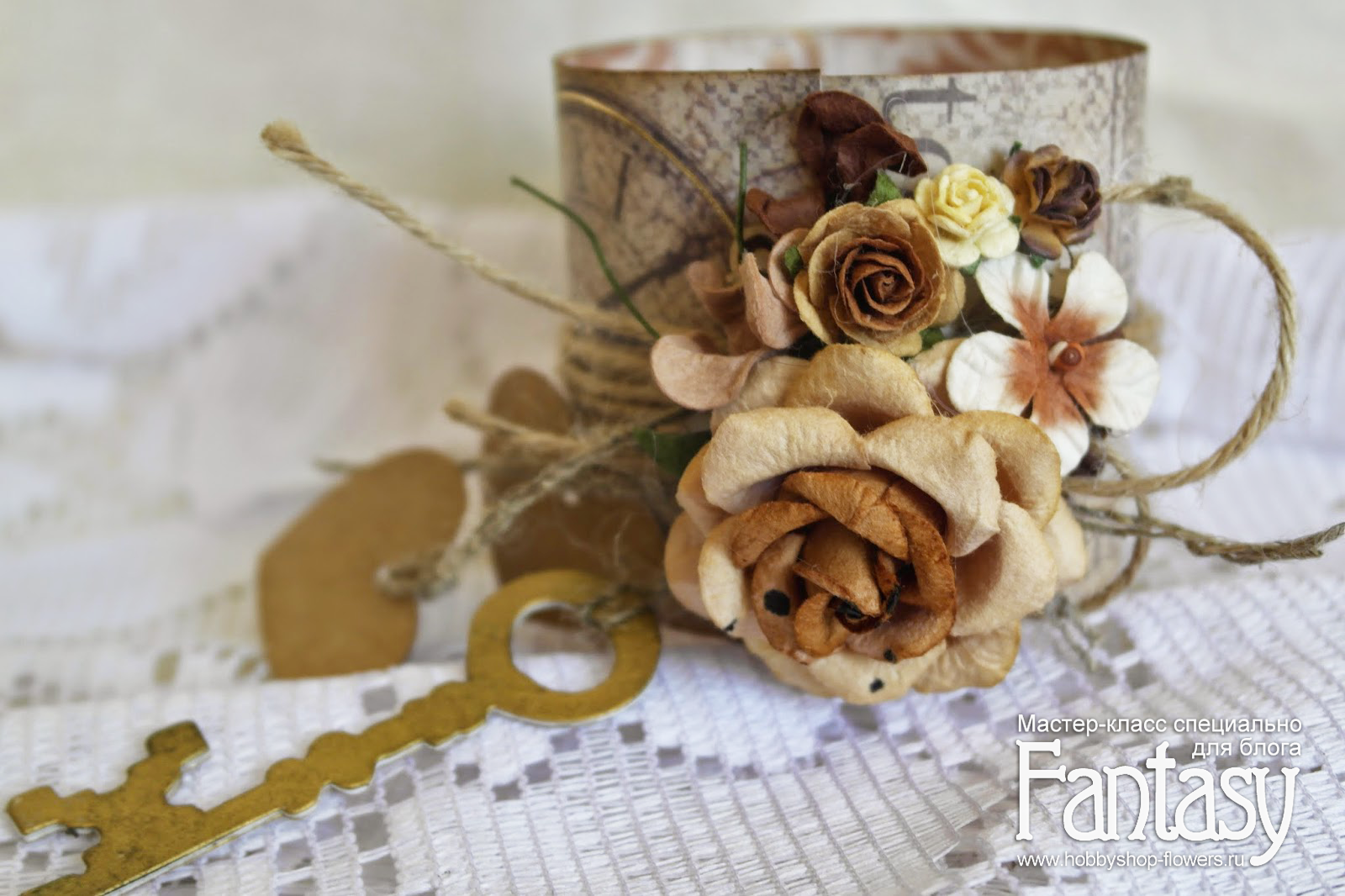 Для кольца-держателя используем остатки бумаги от коробочки. По сути - тут все просто - полоску бумаги, примерно 6.5*21 см склеиваем в кольцо, тонируем чернилами и место стыка декорируем в стиле коробочки и свитка (мне бумага показалась тонковата для кольца, я взяла два обрезка и склеила между собой). В декоре использовала, пеньковую веревку, вырубки сердечки и ключик, кусочек чипборда, который использовала в декоре коробочки и, конечно, цветы....