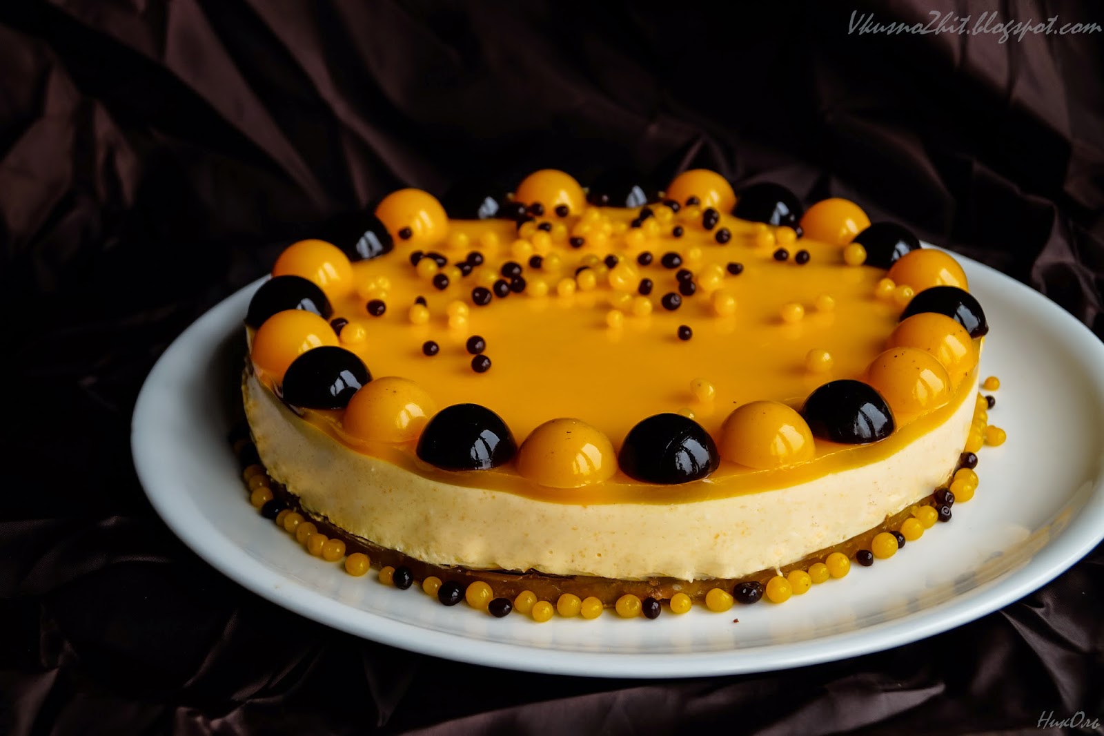 Вынимаем торт из формы, снимаем пленку, перекладываем на блюдо. Украшаем "икрой", можно также украсить облепиховыми и кофейными полушариками, сделанными по тому же принципу, что и "икра".