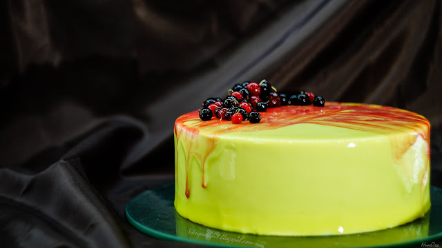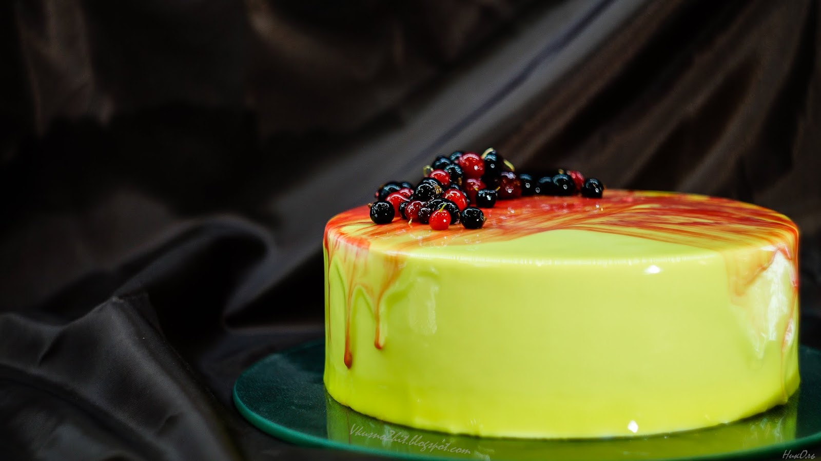 Торт достаем из морозилки, вынимаем из формы, снимаем пленку. Ставим на решетку или перевернутую глубокую тарелку. Тарелку/решетку ставим на поднос для сбора глазури ,которая будет сливаться с торта. Выливаем красную глазурь в зеленую/салатовую,не перемешиваем. Обливаем торт глазурью. Ничем не разравниваем, даем глазури самой распределиться и полностью стечь. При необходимости одним движение ножа убираем лишнюю глазурь с верха торта. Снимаем с решетки/тарелки, убираем излишки глазури по краю и перекладываем торт на тарелку. Украшаем по желанию.