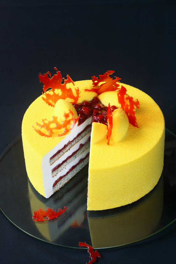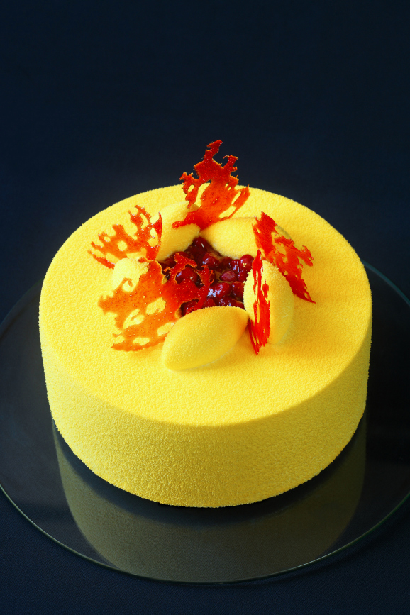 6) Замороженный мусс выложить из формочек quennelle и разложить в центре замороженного торта. Сразу же покрыть жёлтым шоколадным велюром. В центр выложить отложенный земляничный компоте. Перед самой подачей украсить торт декором из изомальта.