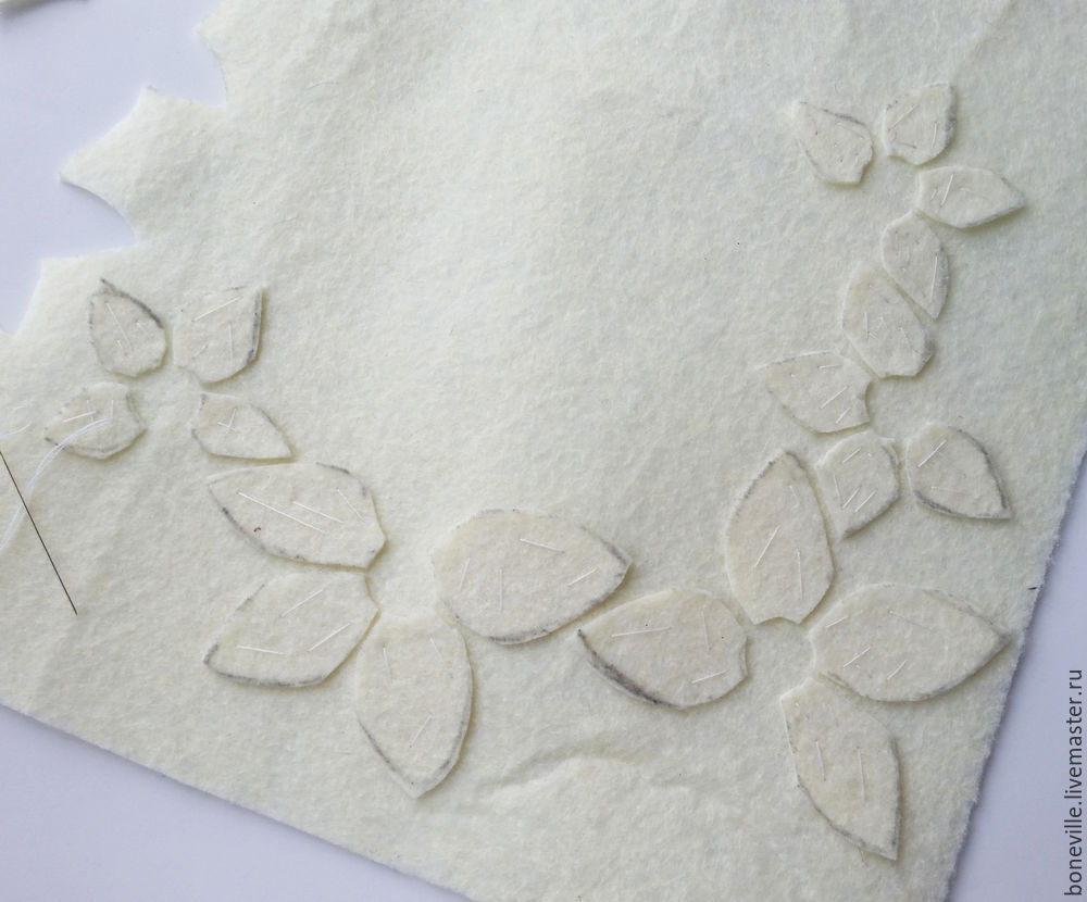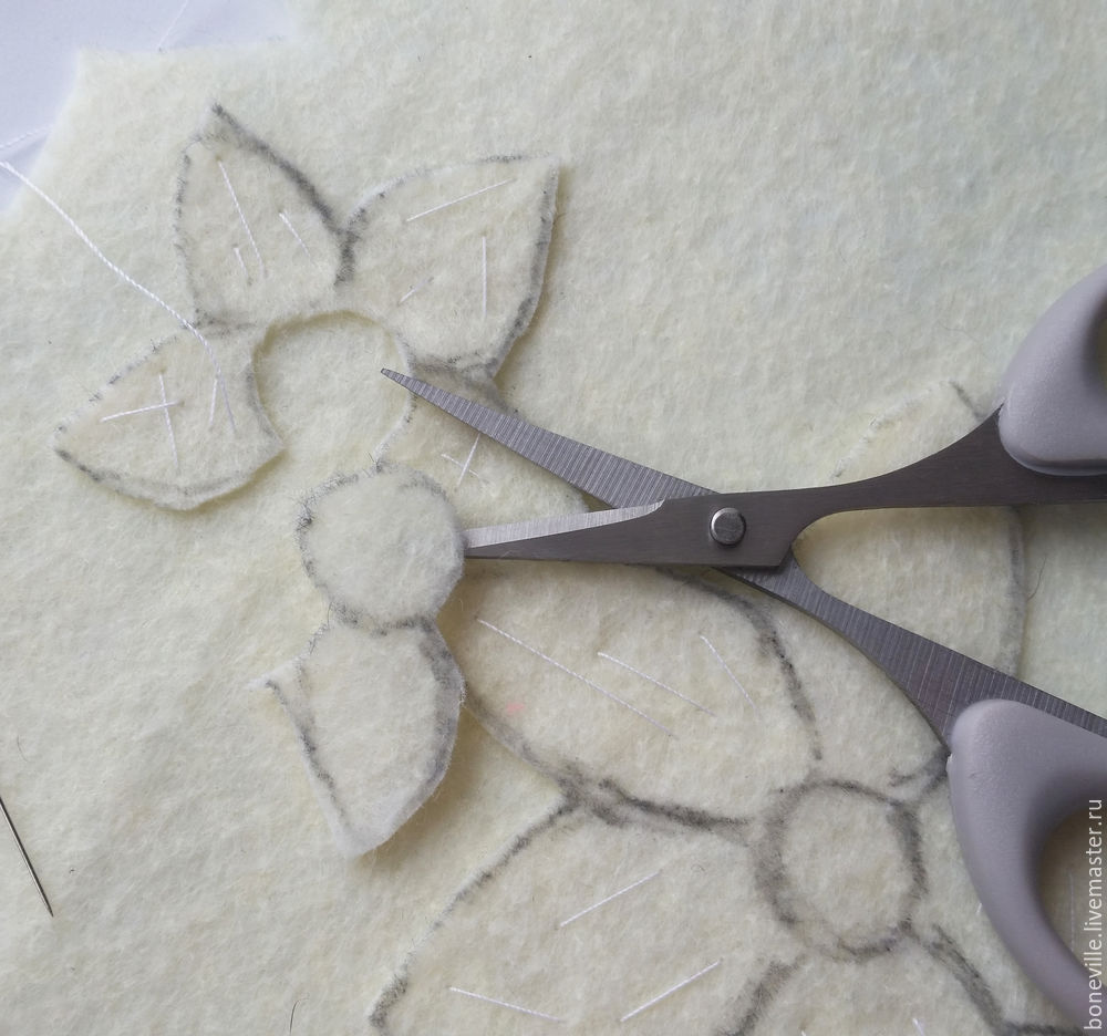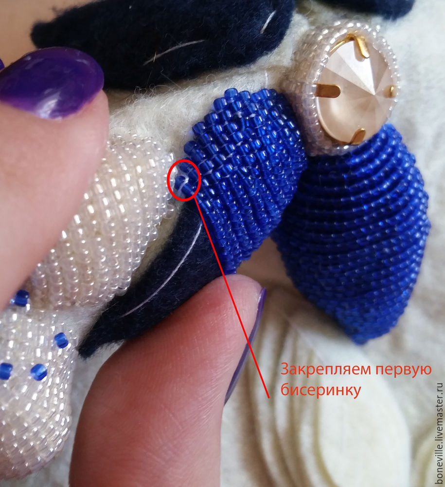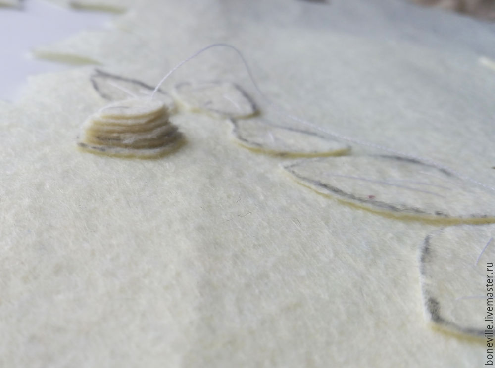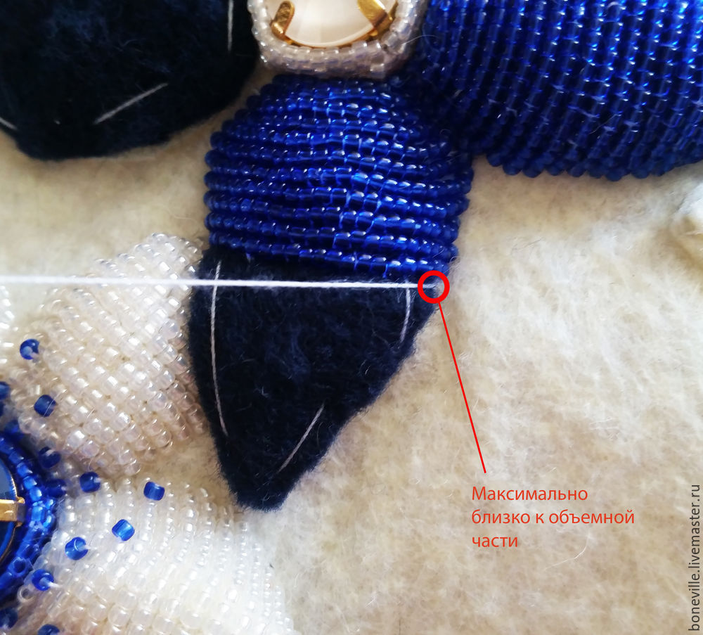 Совет: чтоб было легче выполнять бисерные ряды, а еще если «не набита рука», рекомендую пройтись мелкими стежками по контуру объемной фетровой части и притянуть потуже ее к основе. Таким образом начало и конец бисерного ряда выполнить легче.