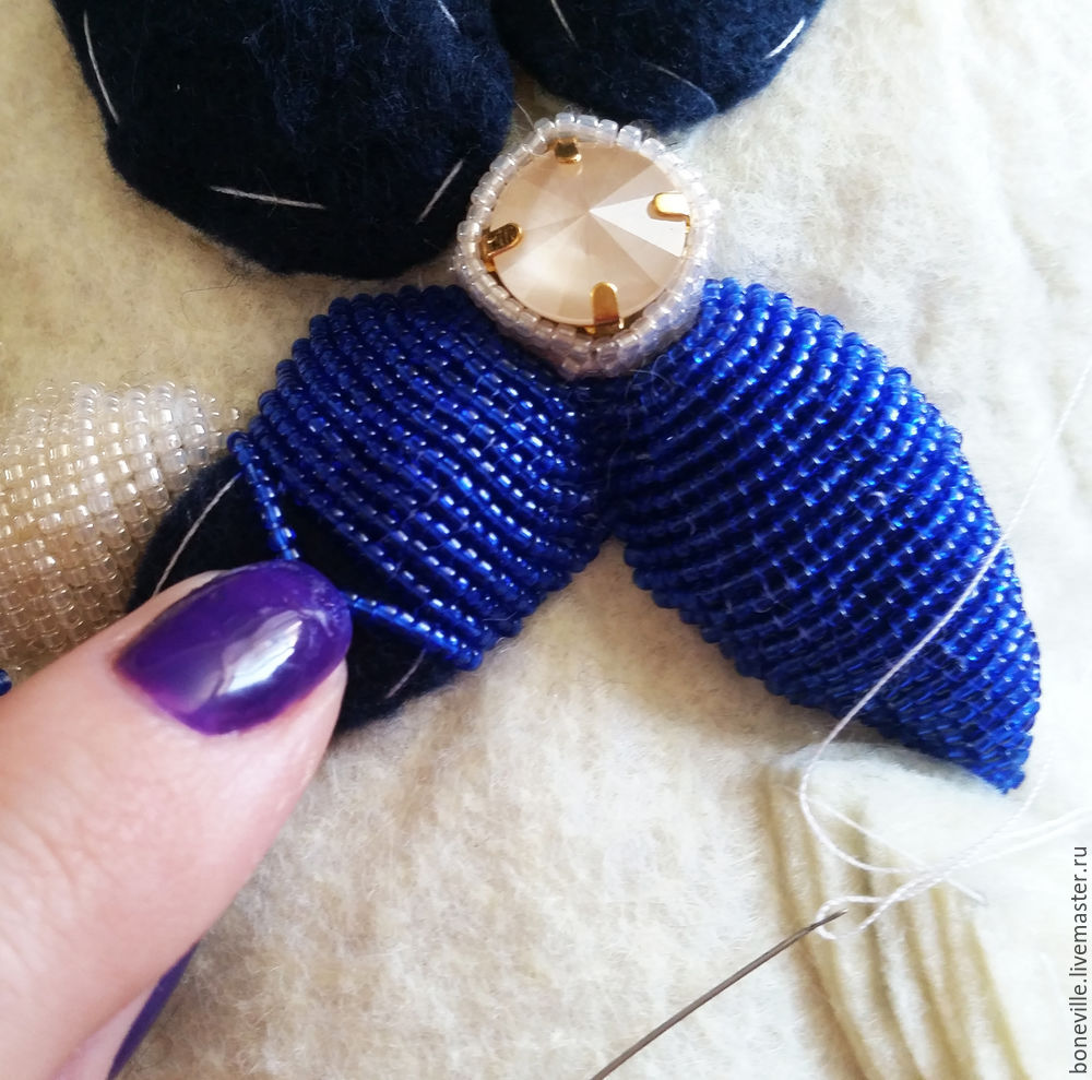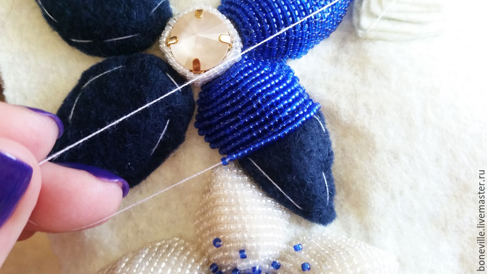 Совет: хорошо затягивайте, но не перетягивайте нитку. Необходимо контролировать хорошее натяжение нити, чтоб закрепить бисер, но в то же время не стянуть мягкую фетровую объемную основу.