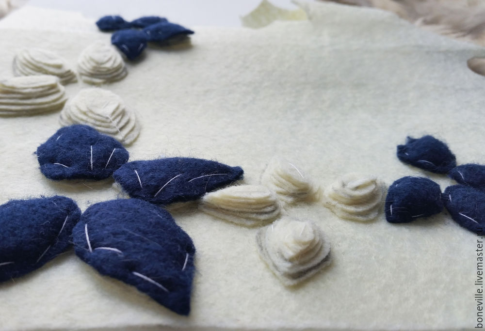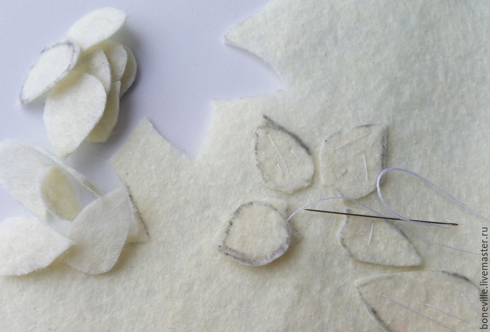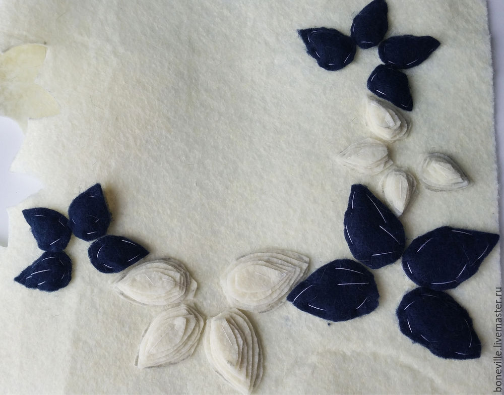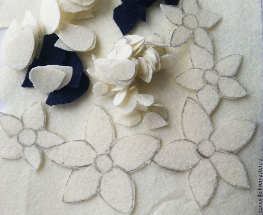 Каждый последующий лепесток должен быть чуть меньше предыдущего. Я подгоняла уже в процессе пришивания. Темные лепестки должны быть самые большие — они лягут сверху светлого фетра, чтоб служить основой для синих цветочков. Получается ворох мягких лепестков + основная деталь, нарисованная по выкройке.