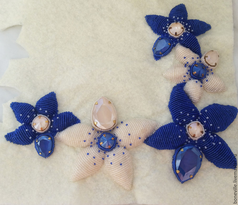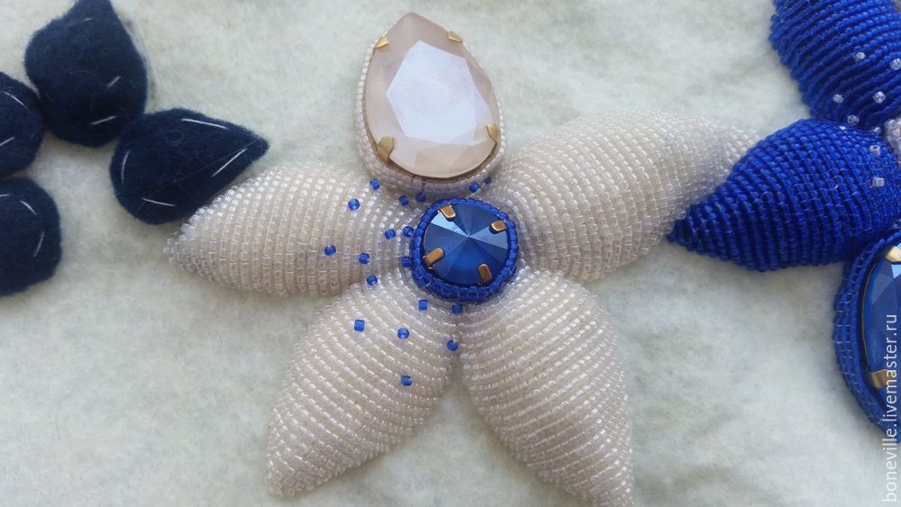 Лепестки выполняются в технике - объемная вышивка бисером. У каждого цветка — контрастная серединка из стразинки и 1 лепесток — капля Сваровски. Объемная вышивка — это вышивка бисером в прикреп по объемной основе. Получаются идеально ровные ряды бисера. Вышивка данного колье выполнялась бисером 15-го размера.