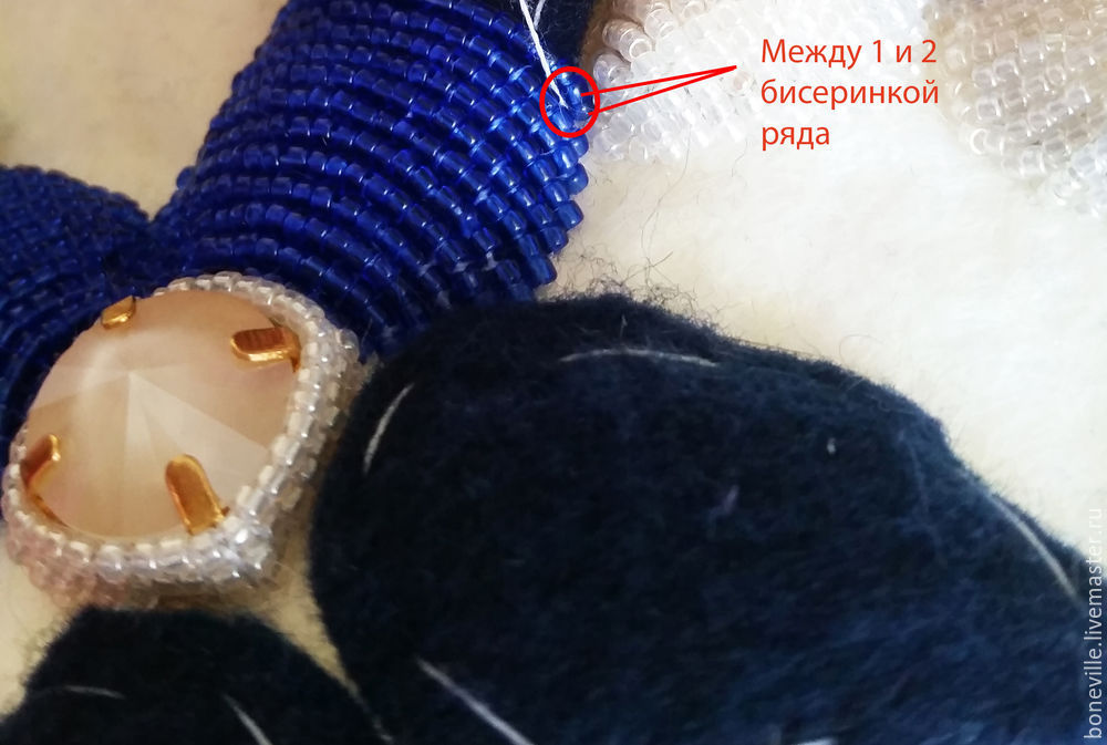 Втыкаем иголку макскимально близко у окончания объемной части и хорошо затягиваем ряд. Не перетягиваем, а именно хорошо затягиваем, чтоб бисер не болтался.