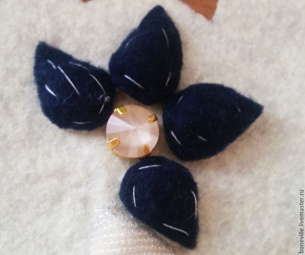 Когда 4 бисерных лепестка вышито, необходимо завершить цветок кристаллом. Берем капельку Сваровски в оправе и аккуратно помещаем ее в цветок. Чтоб легче справиться с кристаллом, можно нанести по контуру оправы клей момент и прижать к фетру. Покажу эти шаги на примере светлого цветочка.