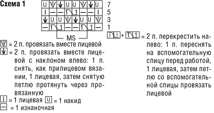 Джемпер из журнала «Verena. Спецвыпуск» № 1/2017 связан спицами. Карманы романтичного джемпера выполнены лицевой гладью и украшены прекрасными вязаными розами. «РОЗА» Вязать по схеме 2. «ЛИСТОЧЕК» Вязать по схеме 3. ![]() ПОДЧЕРКНУТЫЕ УБАВКИ С правого края = после кромочной 2 п. провязать с наклоном влево (= 1 п. снять, как лицевую, 1 лицевая и снятую петлю протянуть через провязанную). С левого края = перед кромочной 2 п. провязать вместе лицевой. ПЛОТНОСТЬ ВЯЗАНИЯ 22 п. х 27 р. = 10 x 10 см, связано сетчатым узором; лицевая гладь – 26 р. = 10 см. ВЫКРОЙКА ВЫПОЛНЕНИЕ РАБОТЫ СПИНКА Набрать на спицы 90 (98) 110 п. и для планки связать 1 см = 2 р. изнаночной гладью и 1 р. лицевой гладью, при этом начать с 1 изнаночного ряда. Далее вязать ажурным сетчатым узором. Для пройм через 26,5 см = 72 р. от конца планки с обеих сторон закрыть 1 x 2 (2) 4 п., затем для скосов реглан с обеих сторон подчеркнуто убавить 19 (22) 25 раз в каждом 2-м р. по 1 п. Для горловины оставшиеся 48 (50) 52 п. через 41,5 см = 112 р. (43,5 см = 118 р.) 45,5 см = 124 р. от конца планки отложить, при этом в последнем изнаночном ряду все петли вязать изнаночными. ПЕРЕД Вязать так же, как спинку. РУКАВА Набрать на спицы для каждого рукава по 42 (46) 52 п. и выполнить планку, как на спинке. В последнем ряду равномерно прибавить 32 (36) 42 п. = 74 (82) 94 п. Далее вязать ажурным сетчатым узором. Через 15 см = 40 р. от конца планки с обеих сторон закрыть 1 x 2 (2) 4 п. и скосы реглан выполнить, как на спинке. Оставшиеся 32 (34) 36 п. через 30 см = 80 р. (32 см = 86 р.) 34 см = 92 р. от конца планки отложить, при этом в последнем изнаночном ряду все петли провязать изнаночными. КАРМАН (2 ДЕТАЛИ) Набрать на спицы для каждого кармана по 25 п. и вязать 10 см = 26 р. лицевой гладью, затем все петли закрыть лицевыми. РОЗА (2 ДЕТАЛИ) Набрать на спицы для каждой розы по 3 п. и вязать по схеме 2. С 1-го по 12-й ряд связать 2 раза, 25–40-й ряды связать 2 раза, затем 57–78-й ряды повторить 3 раза = 122 р. Оставшиеся 3 п. закрыть лицевыми. ЛИСТОЧЕК (4 ДЕТАЛИ) Набрать на спицы для каждого листочка по 5 п. и вязать по схеме 3. Через 23 р. нить отрезать и протянуть через последнюю петлю. СБОРКА Выполнить швы реглан. Отложенные 32 (34) 36 п. левого рукава, 48 (50) 52 п. переда, 32 (34) 36 п. правого рукава и 48 (50) 52 п. спинки перевести на круговые спицы = 160 (168) 176 п. Для планки вязать 2 круг.р. изнаночной гладью, при этом в 1-м круг.р. кромочную провязывать с предыдущей или последующей петлей вместе изнаночной = 152 (160) 168 п. Связать еще 1 круг.р. лицевыми петлями, затем все петли закрыть лицевыми. Выполнить боковые швы и швы рукавов. Розы скрутить, начиная от начального ряда, и закрепить несколькими стежками. Розы пришить посередине карманов. Под ними — вершины направлены по косой вниз – пришить по 2 листочка, выполняя шов только по наборному краю. Для декоративных «шишечек» (2 детали) крючком сделать 1 в.п. и связать в нее 1 «шишечку» (3 в.п. и 3 провязанных вместе ст. с/н), затем выполнить цепочку из 15 в.п. и еще 1 «шишечку». Цепочку из в.п. сложить пополам и пришить под каждой розой, при этом «шишечки» должны свисать в направлении к нижнему краю. Выполнить 2 цепочки из в.п., каждая длиной 10 см. Начало, середину и конец цепочек из в.п. пришить под каждой розой (по верхнему краю) так, чтобы получилось 3 петли. Карманы пришить к переду в одну линию с нижним краем пуловера, при этом в середине между двумя карманами оставить свободными 12 (14) 16 см. [показать] |