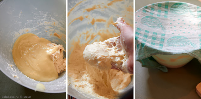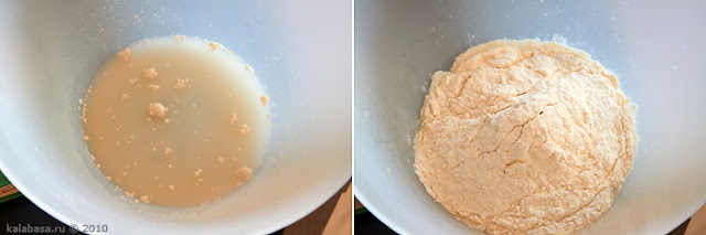 Помешиваем, чтобы сухие ингредиенты растворились в воде. Всыпаем муку, замешиваем некрутое тесто.