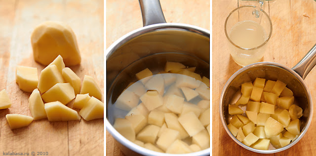 Картофель нарезаете кубиками (неважно, по сути, как нарежете, все равно потом разминать его будем). Кидаете в кастрюльку, наливаете воду, ставите на плиту, на сильный огонь. Даете закипеть, после варите еще 10-15 минут. Воду слить, сохранить (лучше слить ее полностью, а потом понемногу добавлять, чтобы не переборщить).
