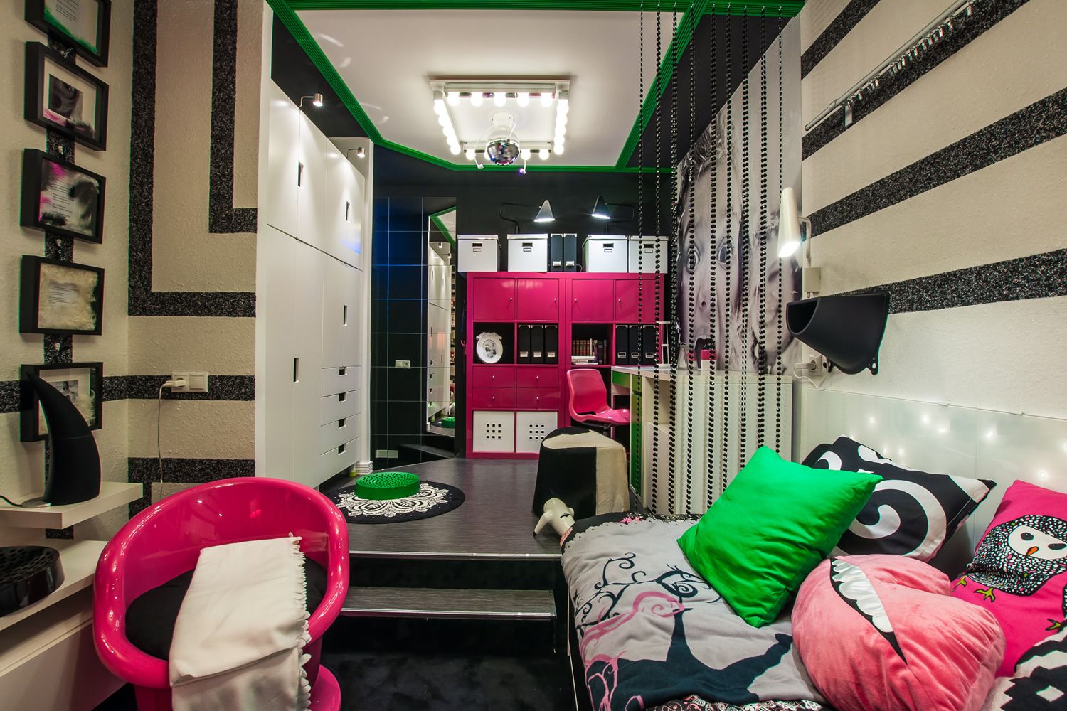 Яркая комната для девочки-подростка, полоски на стенах, выполнены жидкими обоями, визуально увеличивают комнату