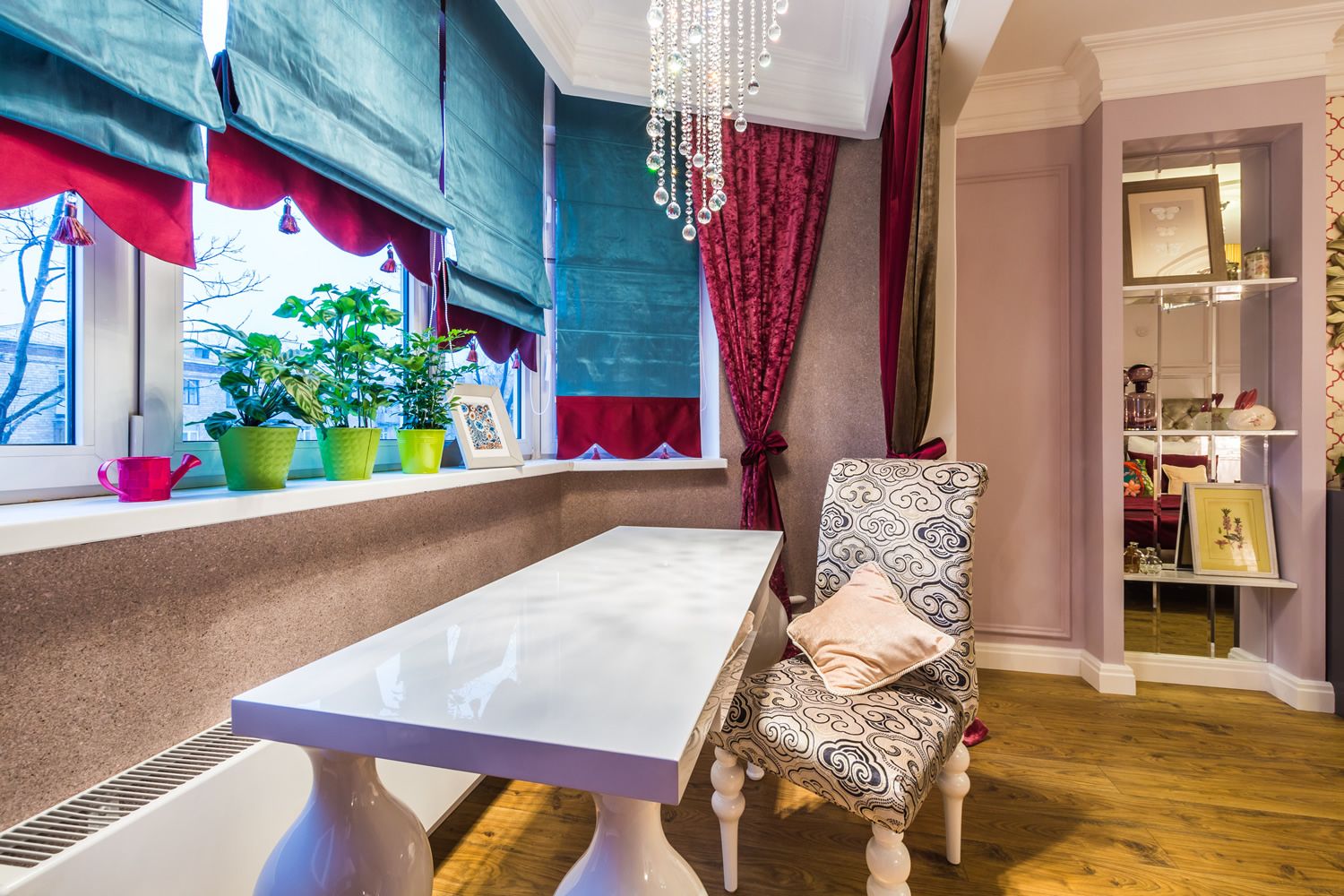 Пастельно-розовые стены в сочетании с ярким текстильным оформлением создадут необычный сочный интерьер
