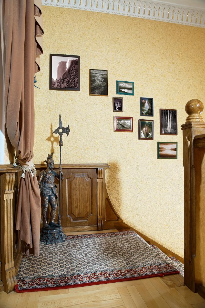 Гостиная в теплых тонах, в отделке стен использовали комбинирование жидких и обычных обоев