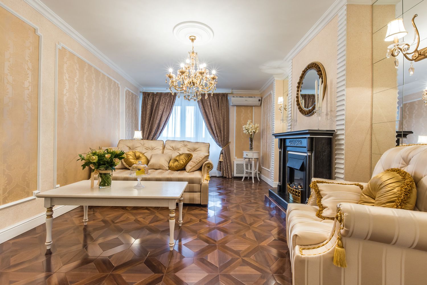 Отделка гостиной и камина жидкими обоями приятного песочного цвета