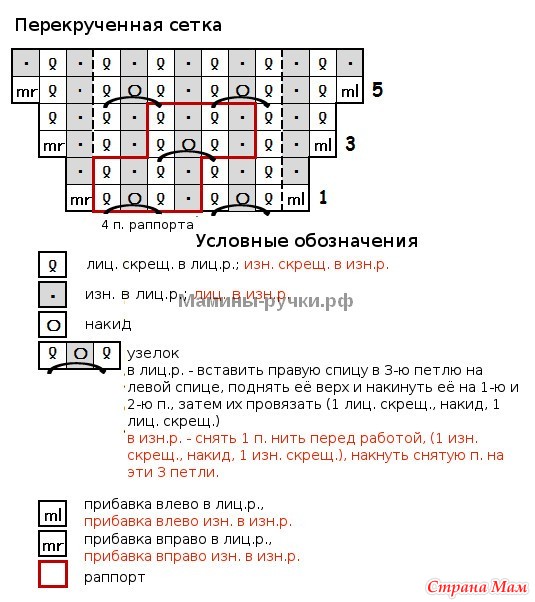 Круг. р. 5: [1 изн., 1 лиц. скрещ.] до м, ум, 1 лиц. скрещ., 1 изн., пм, вязать сеткой как установлено до 2 п. перед м, пм, 1 изн., 1 лиц. скрещ., ум, [1 изн., 1 лиц. скрещ.] до конца.