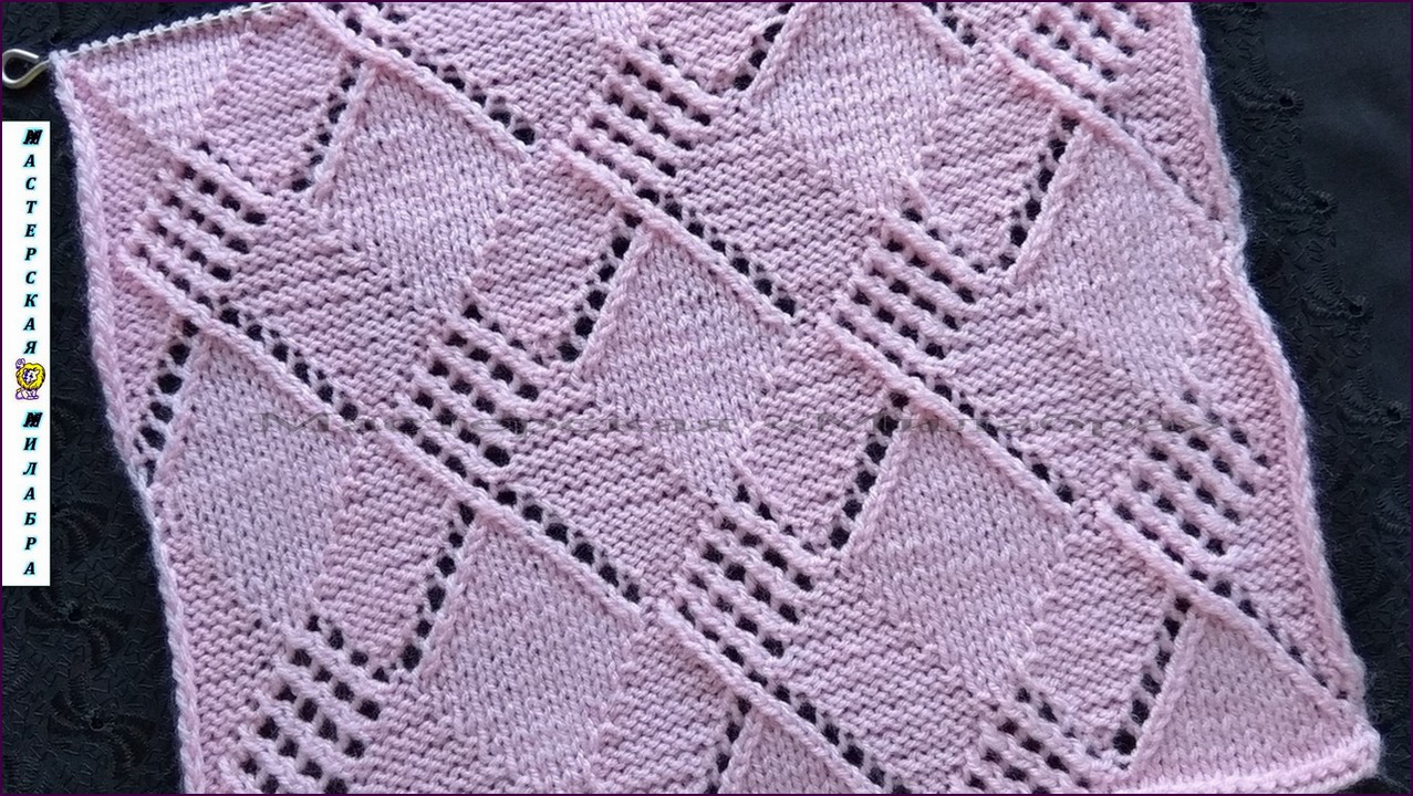 Крупный узор для спиц. Ромбы лицевые, изнаночные и ажурные пересекаются и создают интересный узор.