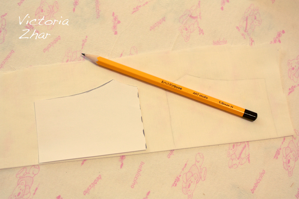 далее переводим выкройку на ткань. есть такой нюанс, что длинную ровную сторону надо прикладывать к сгибу ткани, сложенной вдвое. вот так