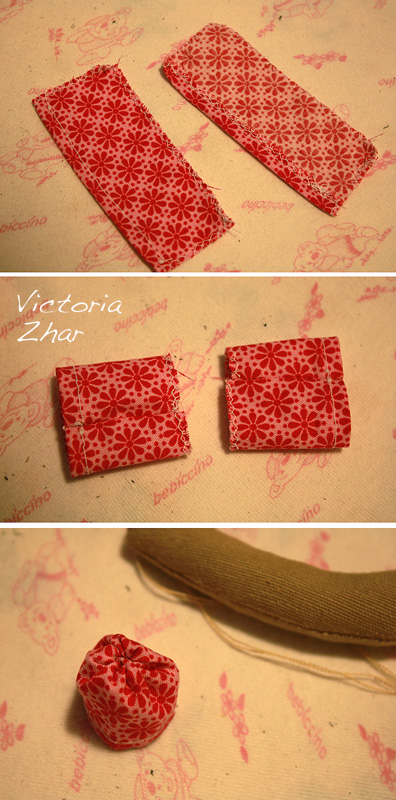 ну и собтвенно пришиваем к голове. я пришиваю их, свернув у края в трубочку. так они лучше стоят. ленда-достаточно плотная ткань. стоИт хорошо. если другая, то я б уплотнила флизелином или дублерином.