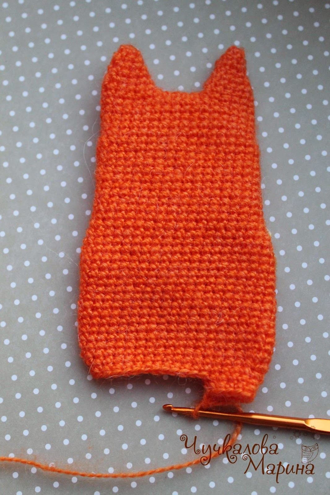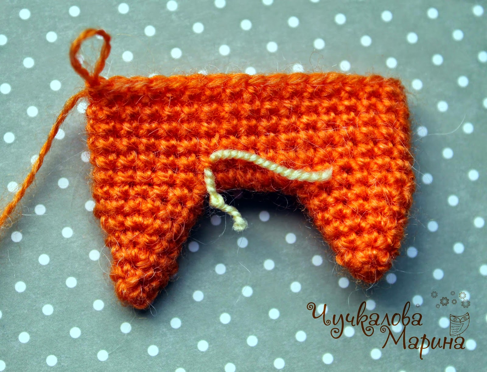 Итак, берем «рыжую» пряжу и начинаем вязать с ушей