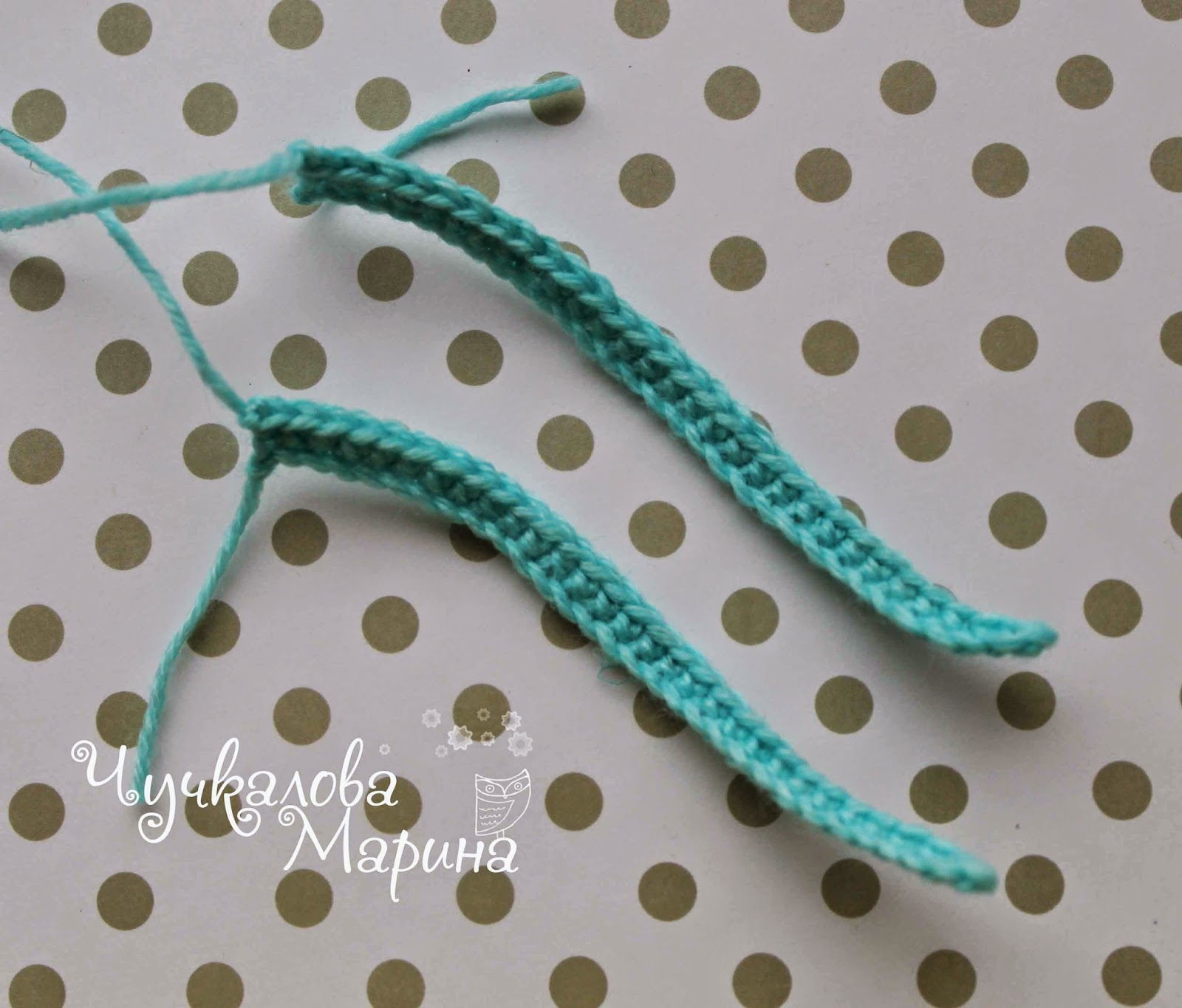 7) Наберите цепочку из 5 в.п. , а далее наденьте открытую петлю первого уха на крючок и продолжайте вязать по кругу первого уха. Затем продолжайте вязать по цепочке из 5 в.п. Т.е. вяжете 12 сбн уха+ 5 сбн цепочки, снова 12 сбн второго уха и 5 сбн. другой стороны цепочки. В итоге у вас должна получиться макушка головы, состоящая из 34 сбн.