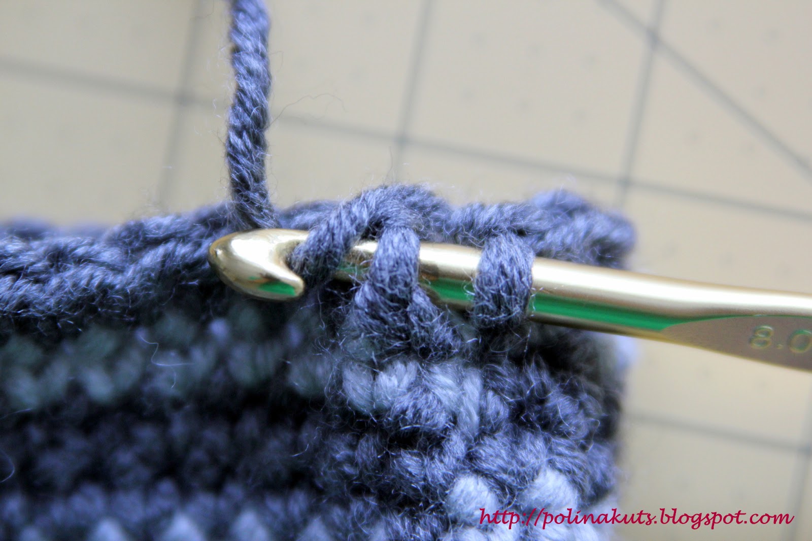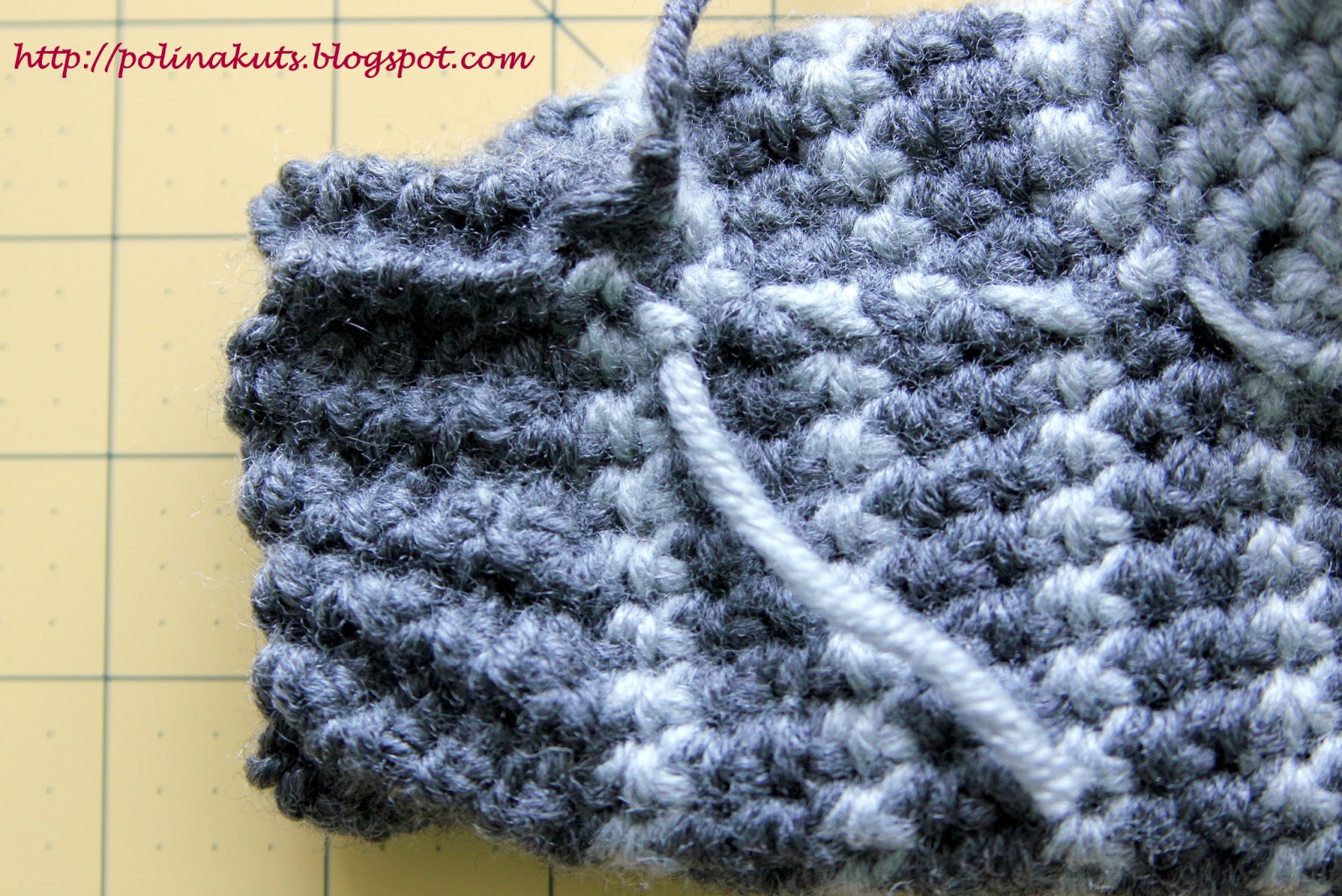 Ряд 5: Теперь надо провязать нитку другого (светло-серый) цвета. Я просто протягиваю новую нитку в петлю, оставив небольшой хвостик.Темную нитку я лишь отодвигаю в сторону. Нитки нигде обрезать не буду до самого низа вережки, а просто буду менять их местами по мере чередования цвета.
