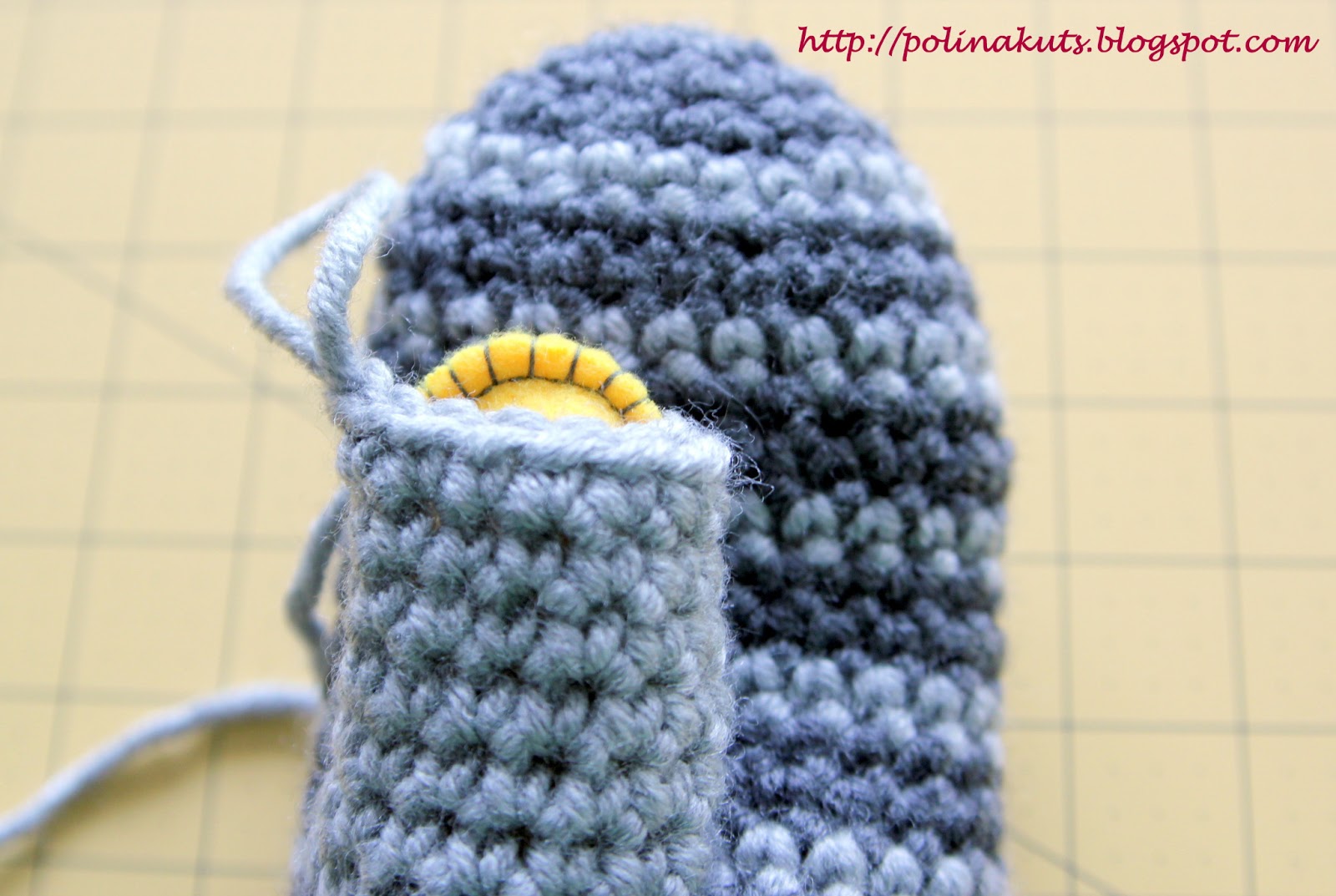 Ряд 20 вяжем светлыми нитками. Когда 20 ряд проходит по воздушным петлям 19-го ряда, цепляем СБН только за заднюю полупетлю воздушной петли. Передняя полупетля нам пригодится для привязывания большого пальца. :)