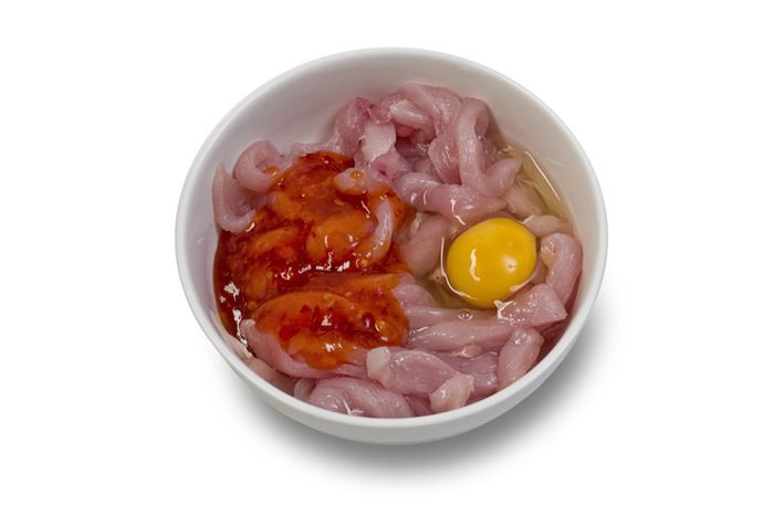 Куриное филе нарезать соломкой, посолить, поперчить, добавить соус чили, кунжутное масло и яйцо. Перемешать и оставить мариноваться на час.