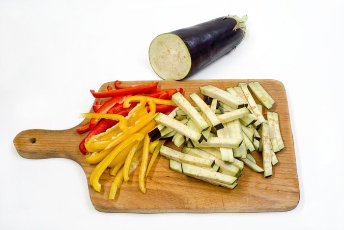 Баклажаны и перец нарезать соломкой. Чеснок и зелень для украшения мелко порубить.