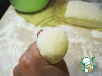 Разделить тесто на 3-4 части, припудрить мукой и вытянуть одну часть в колбаску. Можно нарезать пирожково-порционные кусочки, но я предпочитаю тесто выдавливать, вот так, как на фото. Размером с большой грецкий орех.