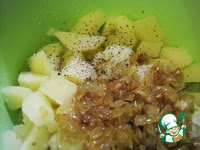 Сегодня у меня пирожки с картошкой. Я жарю лук на смеси раст. и сливочного масла, через минутку солю жарящийся лук, чтобы он быстро отдал свой сок и размягчился. Мешаю с вареным картофелем + соль и перец. Солю «слишком» хорошо, иначе в готовых, почти пресных пирожках — начинка покажется недосоленной.