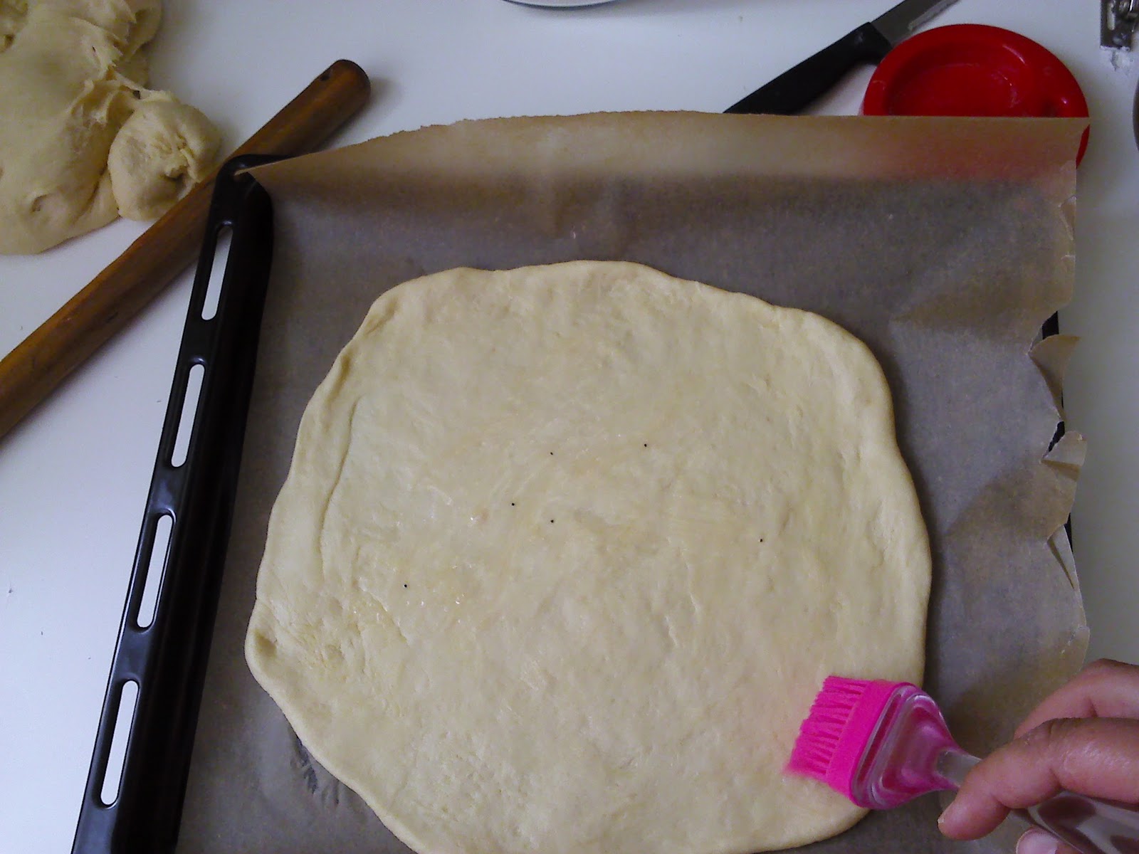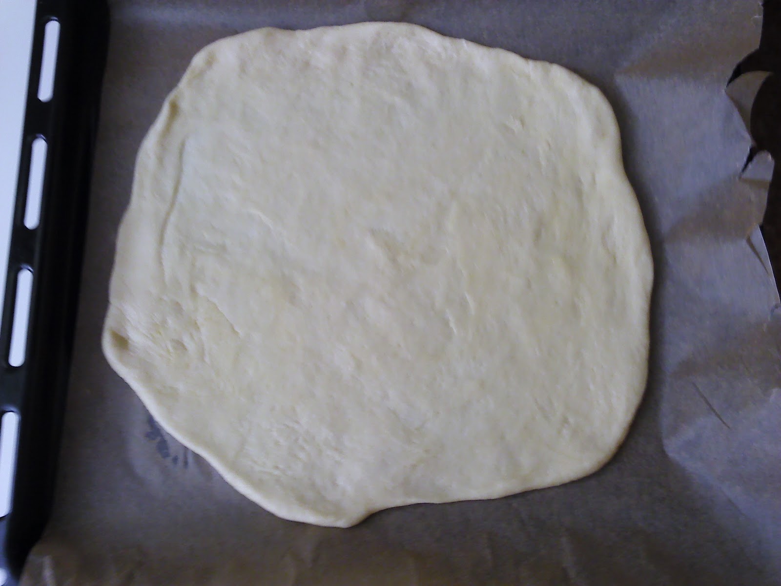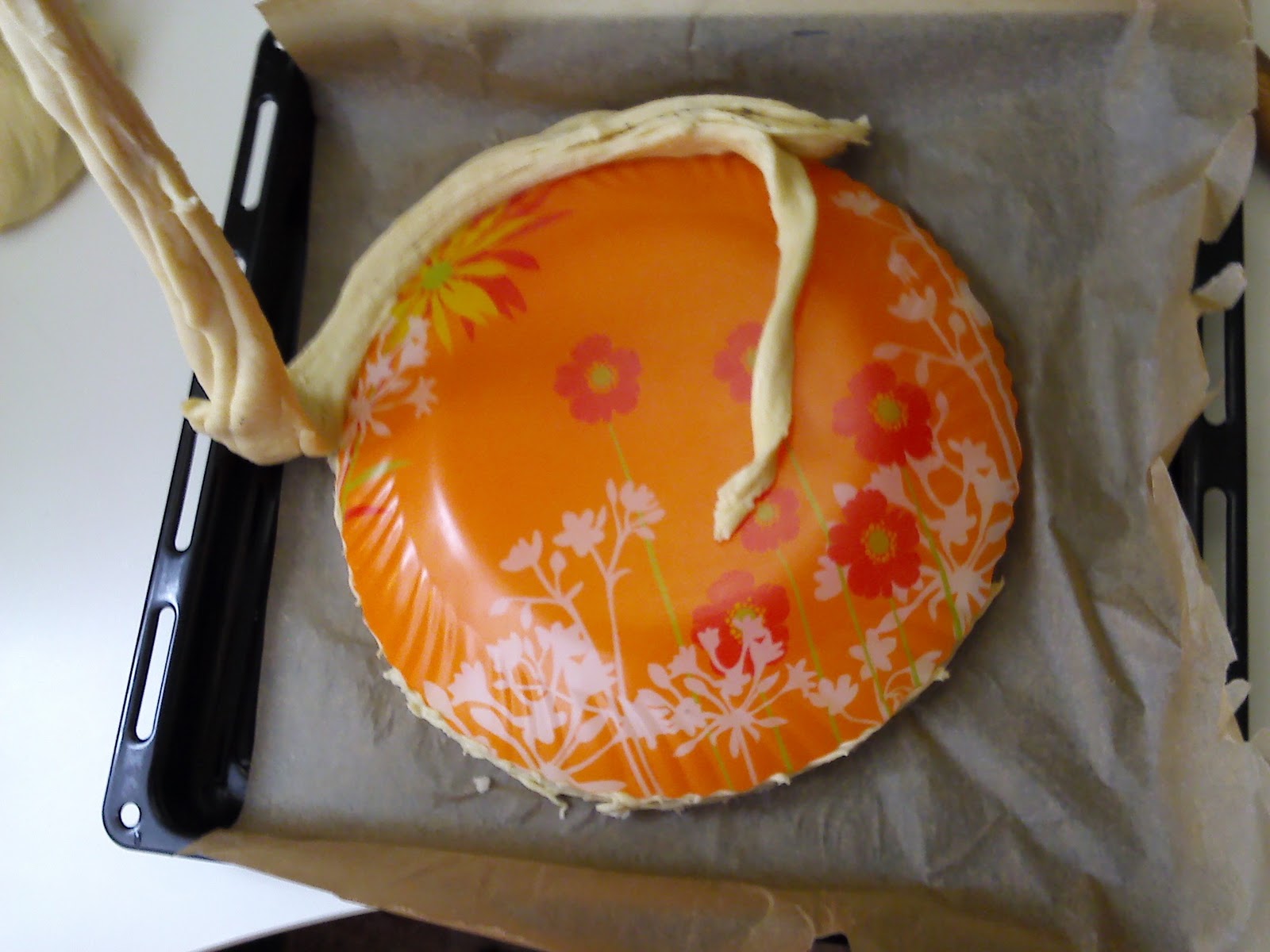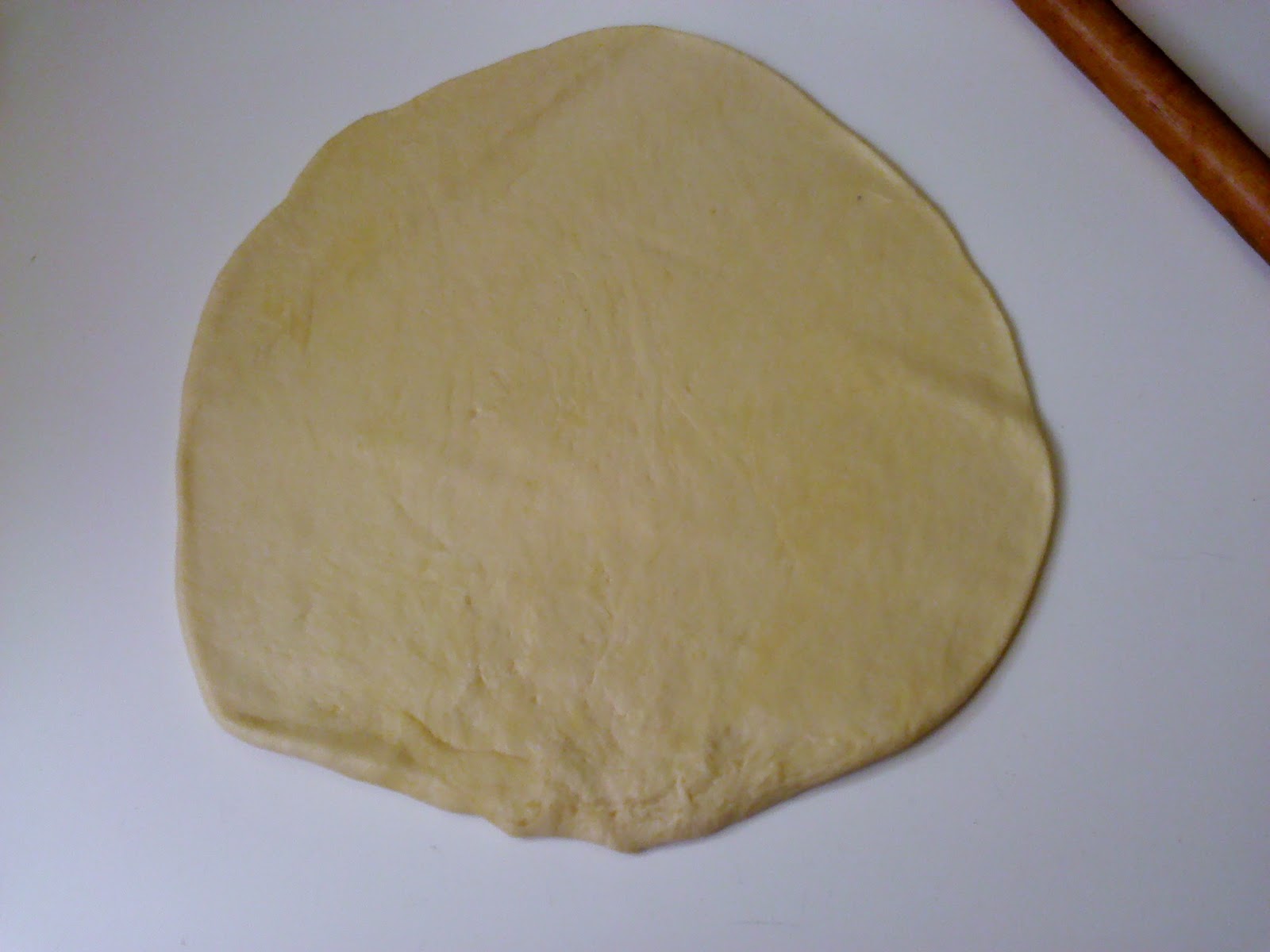 Итак, раскатываем пласт теста, толщиной 0,3-0,5 см, примерно намечаем окружность (у меня с помощью крупной тарелки)