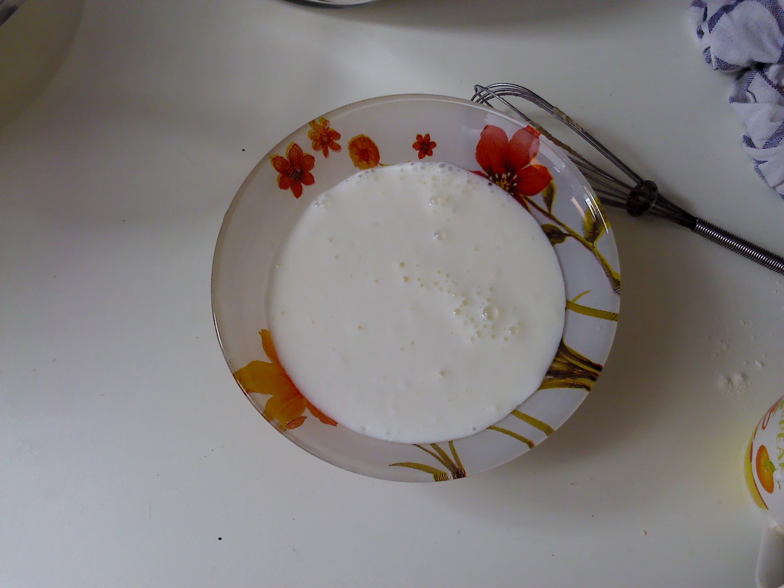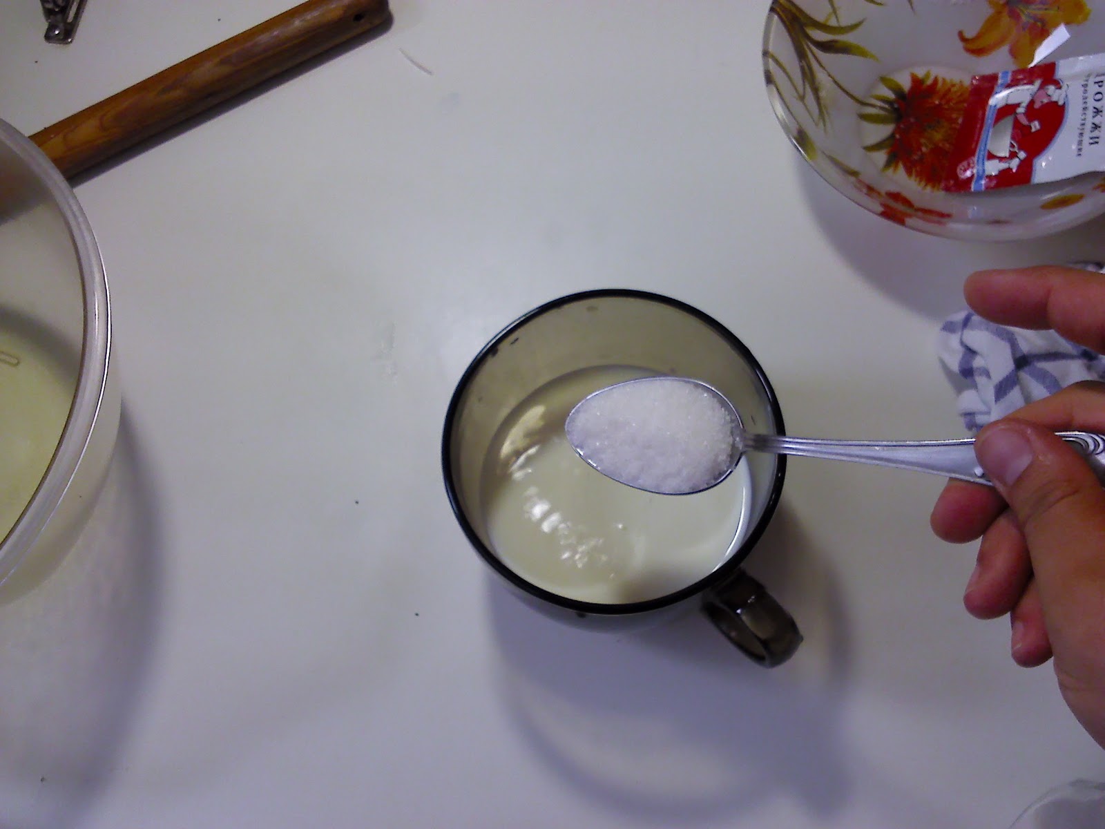 Смешиваем кефир и молоко и ставим в теплое место, либо чуть-чуть подогреваем в микроволновке или на водяной бане, в общем смесь должна быть теплой